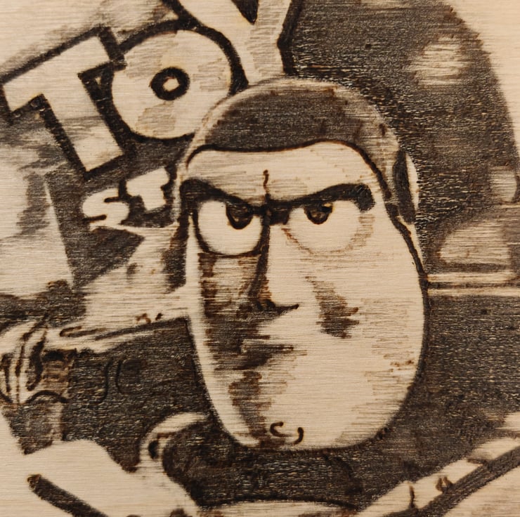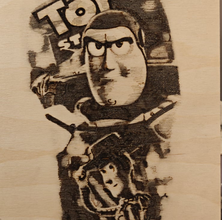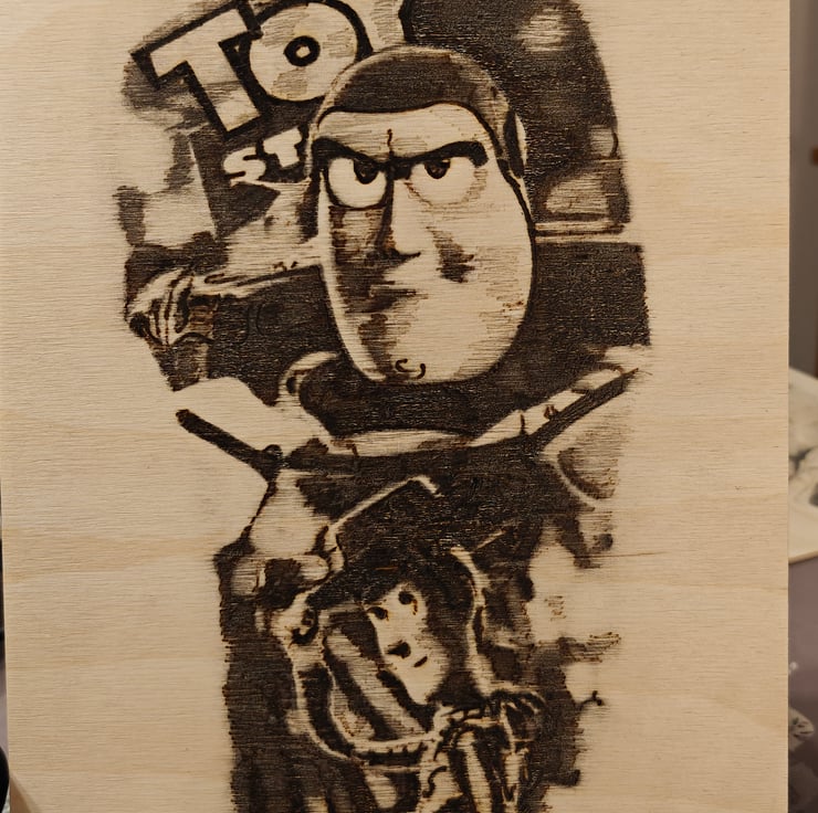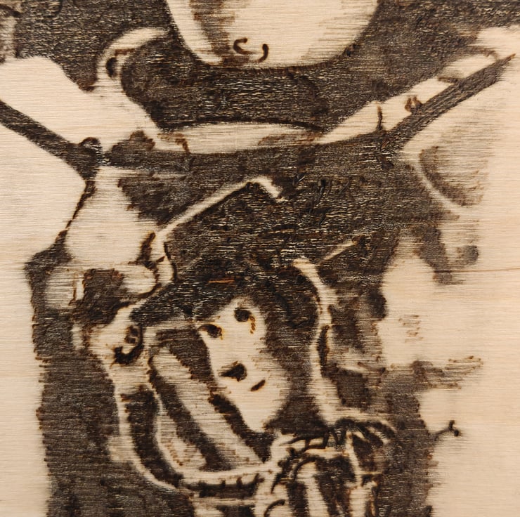 Burnt into 3mm plywood board 21x30cm A4 sized. Finished with varnish and with a wall hook attached