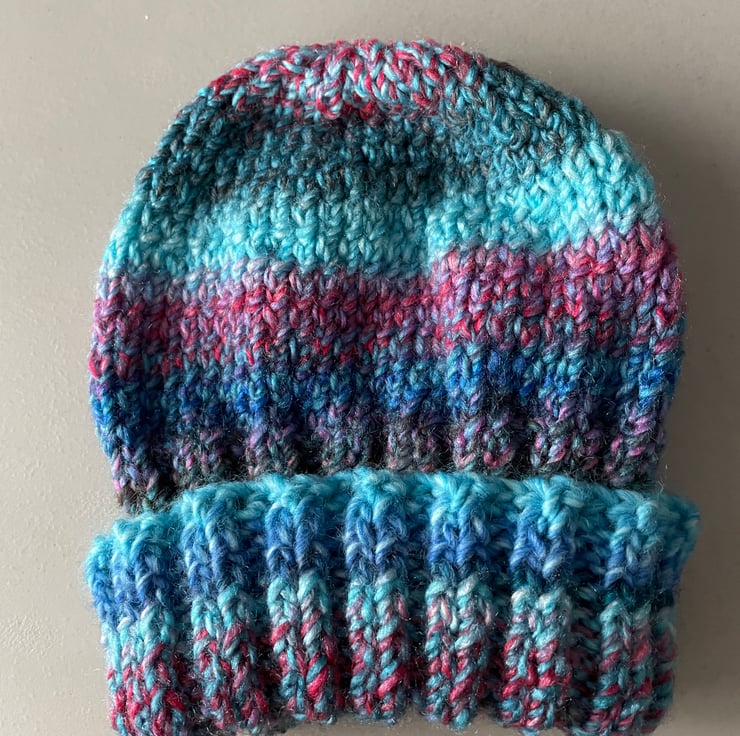 Handknitted multi coloured beanie hat. Age 4 - 6 years. Knitted in soft chunky wool.