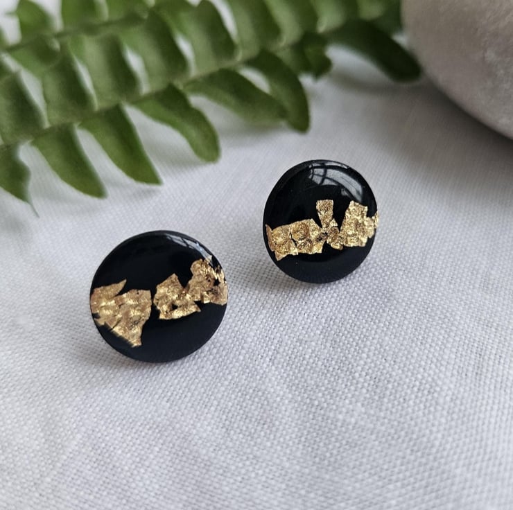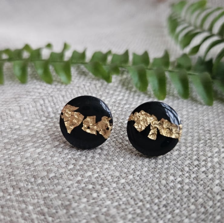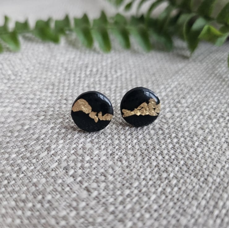 Black and gold polymer clay stud earrings, coated with resin for an extra shine and mounted on a stainless steel earring post.