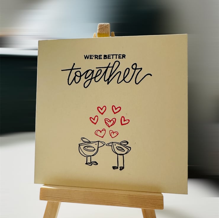 A cute and loving blank card which features the words “we’re better together” above two lovebirds kissing and hearts cascading above them.