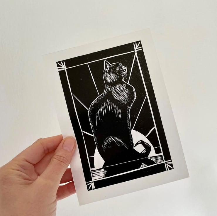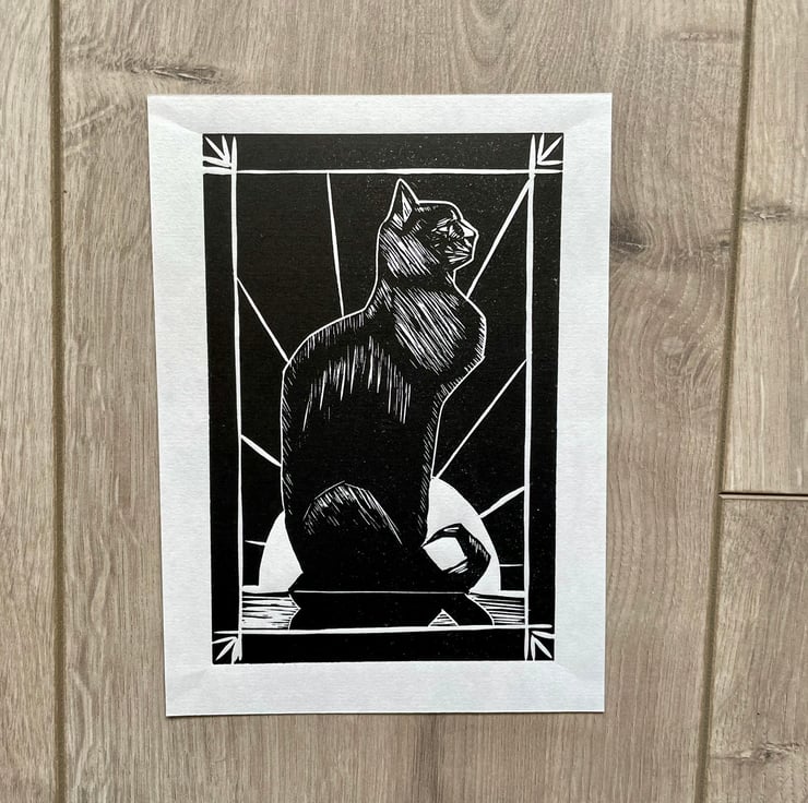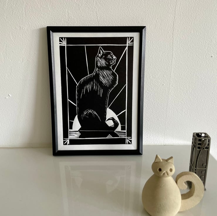 Cat with art deco sun motif lino print - a wonderful gift for a cat lover, especially those who love the elegance of art deco.