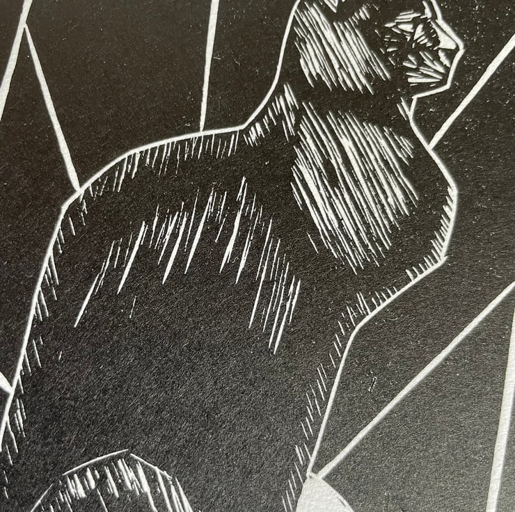 The print is hand-printed on to Japanese HoSho printmakers paper, hand-cut to approximately 127 x 178 mm or 5 x 7 inches. The image is approximately 100 x 152 mm or 4 x 6 inches. The image was created using black Caligo Safe Wash Relief Ink.