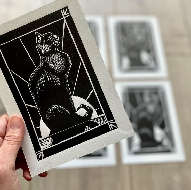 The cat with art deco sun motif was designed, carved into the lino and printed by me.