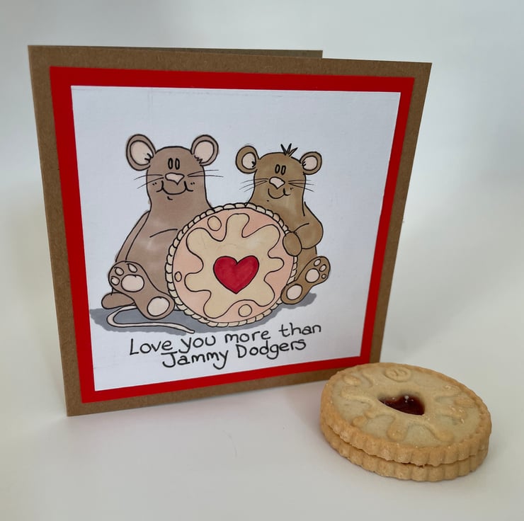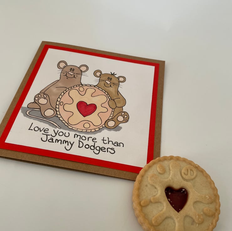 This fun card is created using an original illustration. I have mounted this onto red card and then attached to a natural coloured recycled card blank. The words “Love you more than Jammy Dodgers” are handwritten in black ink.