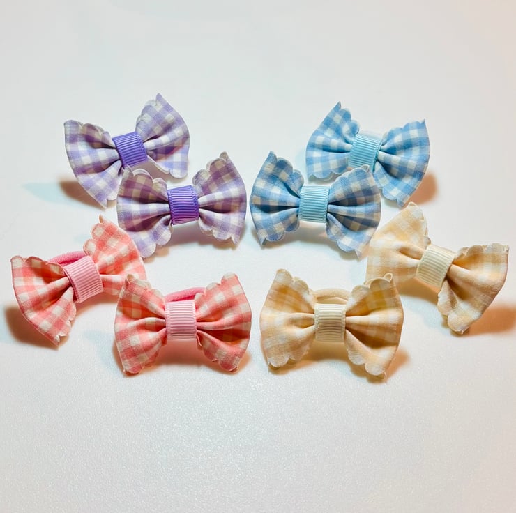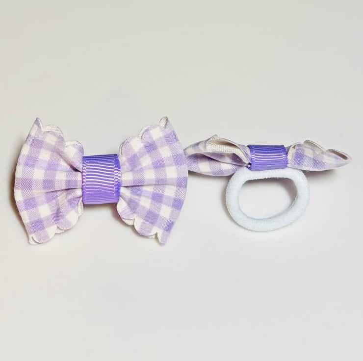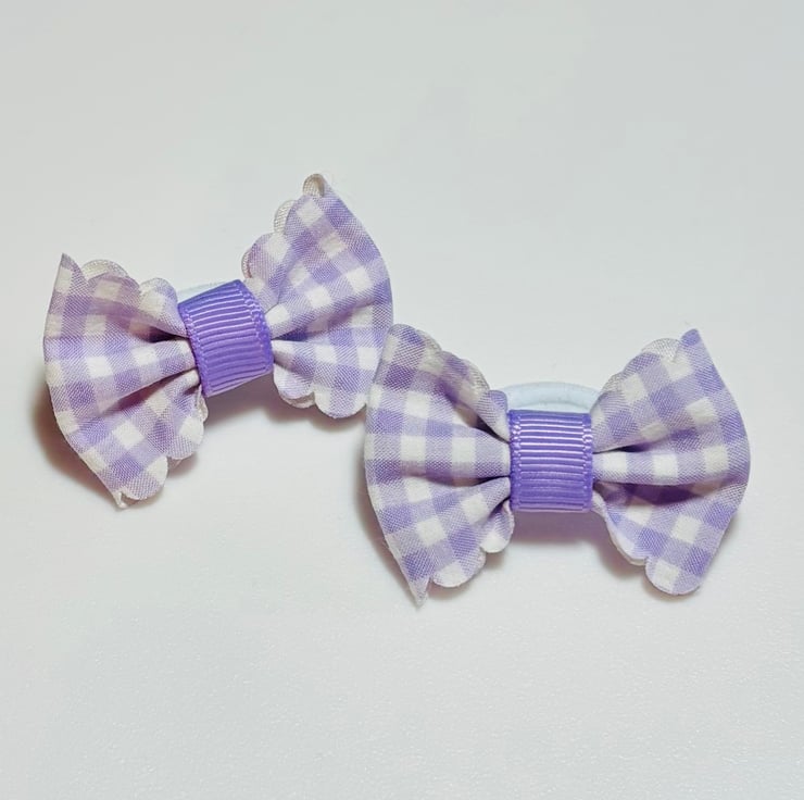 Handmade Lilac and White Gingham bows, set on White mini bands for a soft comfortable hold.