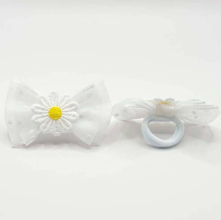 Handmade White Tulle spotted ribbon with cotton sewn daisy flowers, set on white mini bands for a soft comfortable hold.