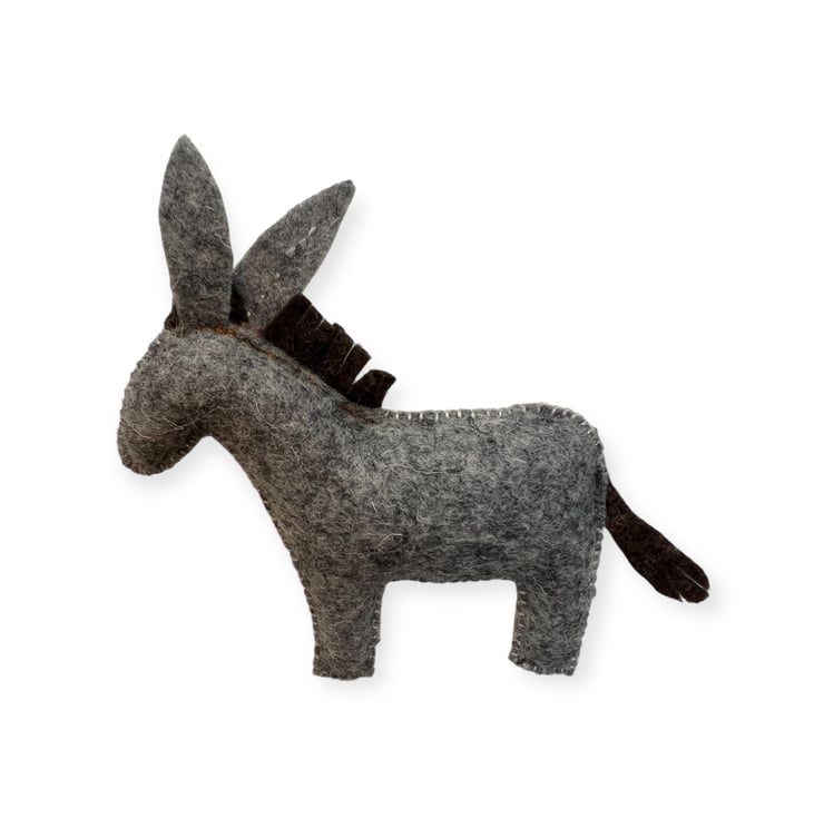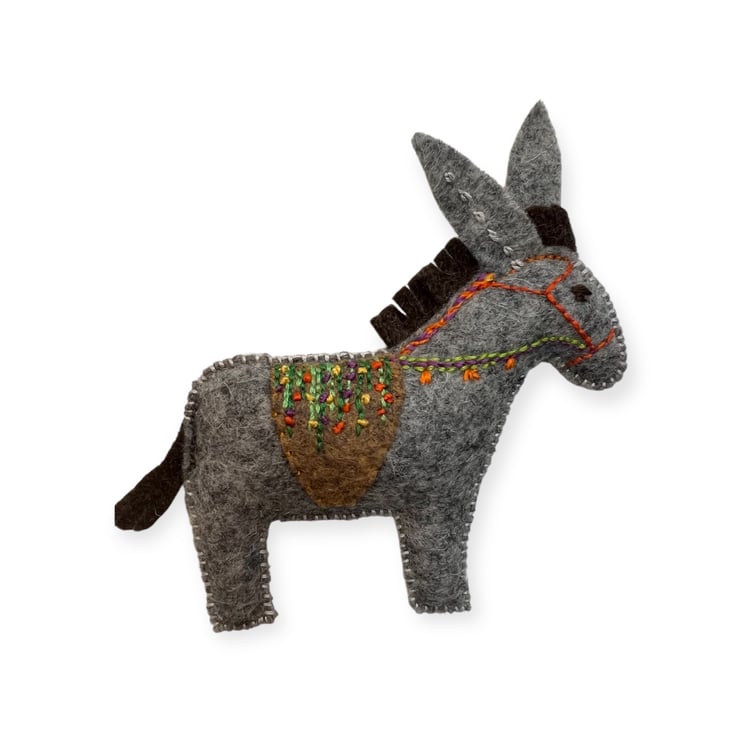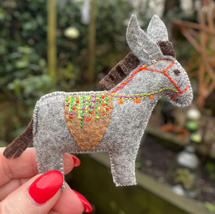 This little brown donkey is made from 100% wool felt and stuffed with pure wool fleece making him an eco friendly choice. He’s hand embroidered with vibrant colourful DMC cotton threads. Each donkey I make is a one off, designed and made by me in The Egg. (see my bio for an explanation)