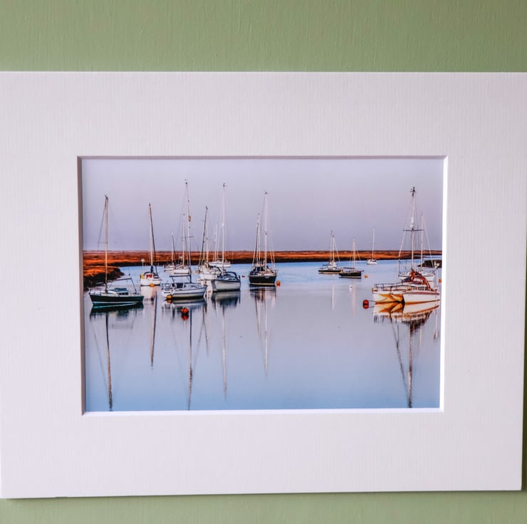 A 10 x 8 ins Mounted Photograph of a high tide in the harbour at Wells, Norfolk. A lovely clear, calm day so all the boats and their reflections were showing up well.