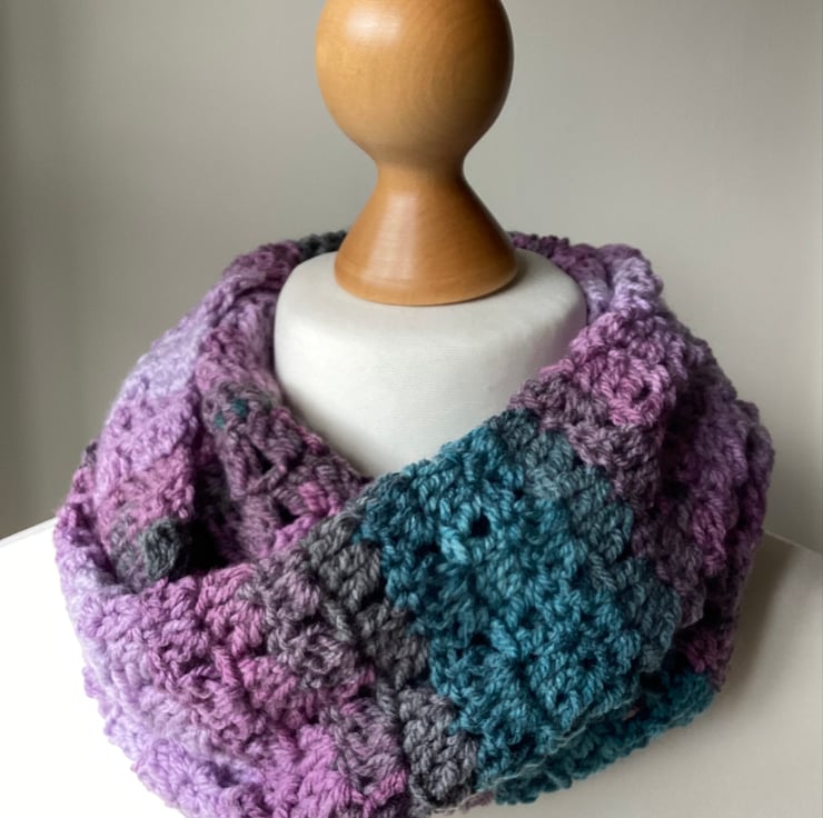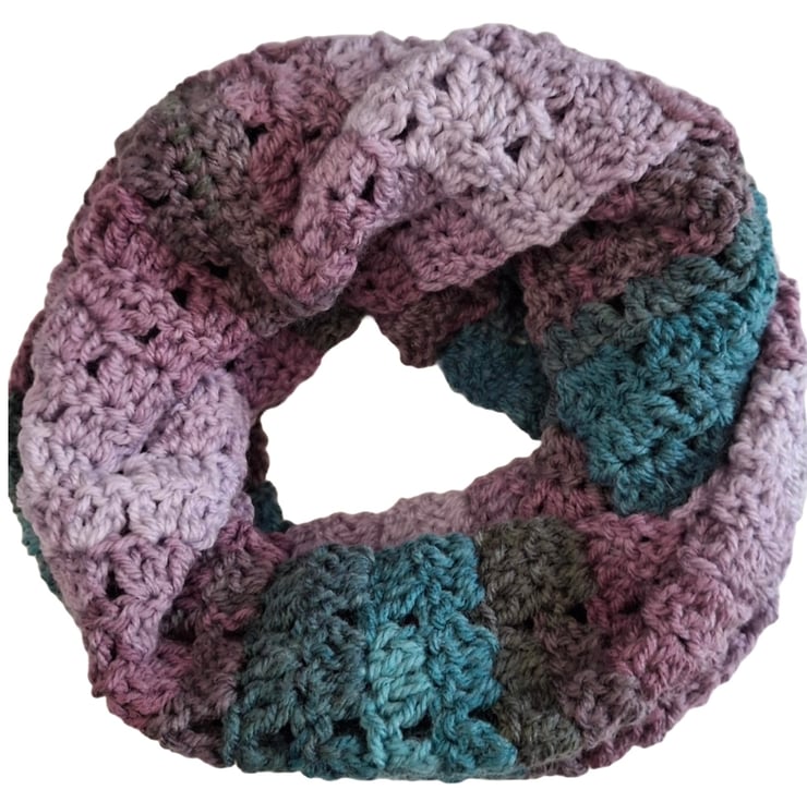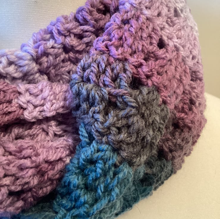 This gorgeous scarf is made in a lovely blend of purples, and teal in a double knit yarn. The Lacy pattern means it will give a little and is designed to sit snugly, but not tightly.