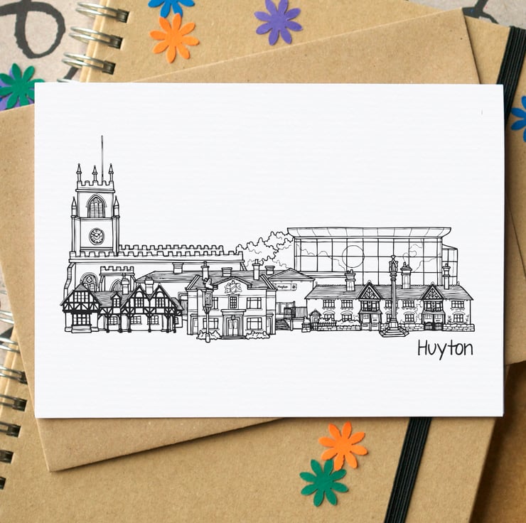 A blank card featuring a skyline illustration of some of the Merseyside town of Huyton's most iconic landmarks.