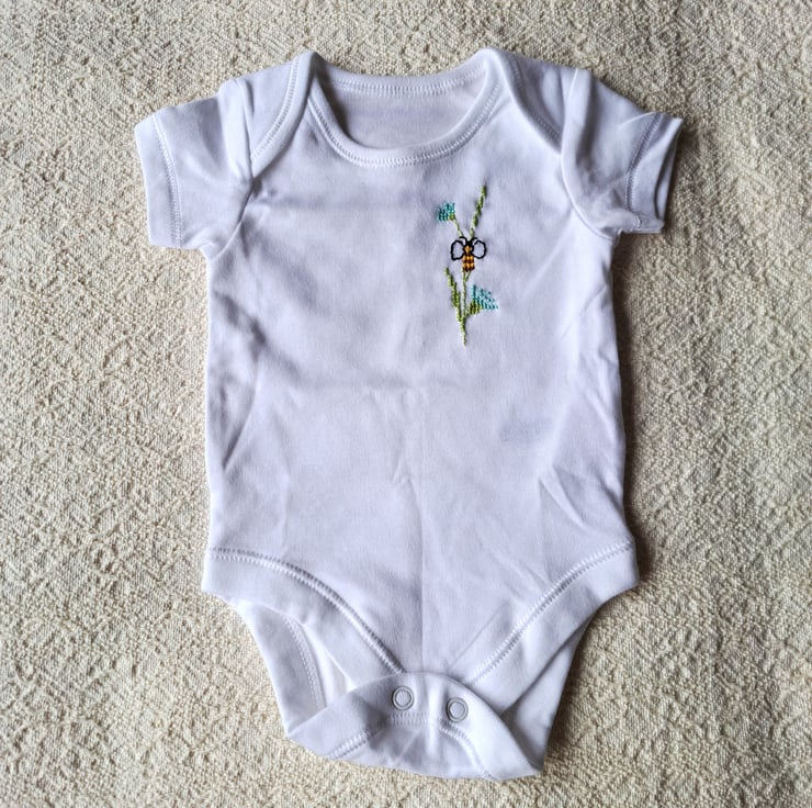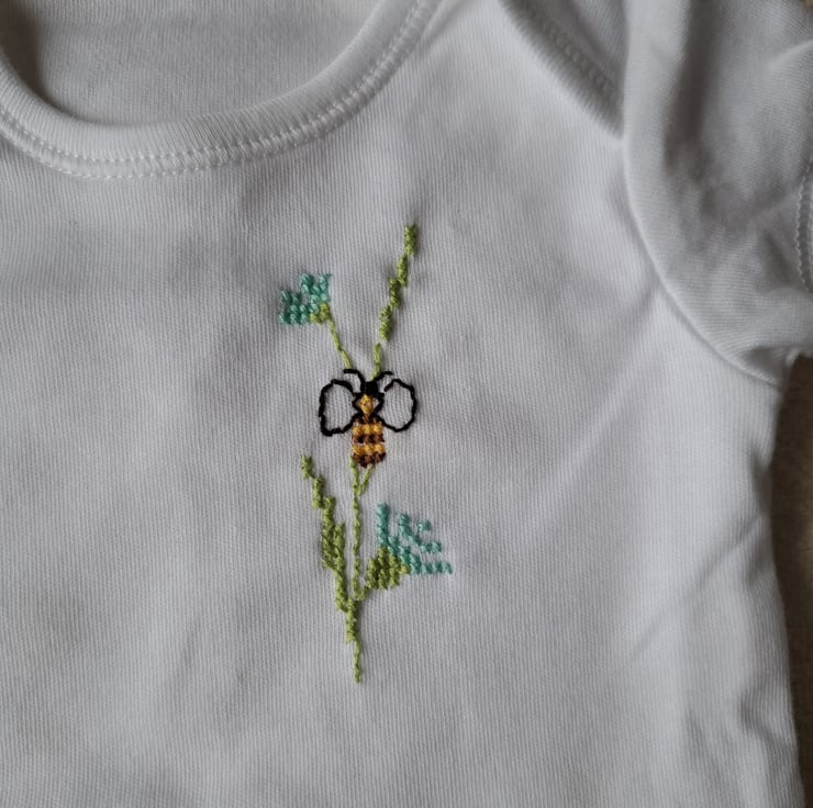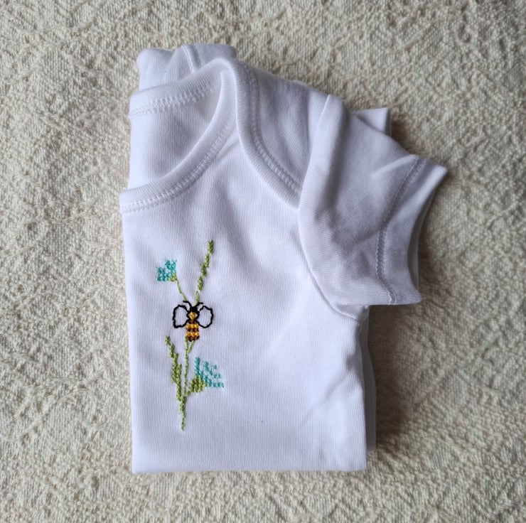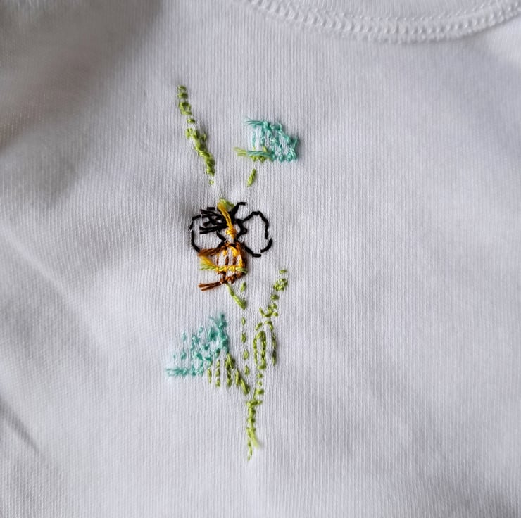 I have hand stitched a bee visiting a tall spray of light blue flowers on the front of this soft white vest/onesie. As I never use a permanent backing material when hand embroidering kids' clothing, there is nothing inside the vest to irritate your baby's skin. It has short sleeves, an envelope neck and two press studs between the leg openings. The vest is all cotton and can be machine washed.