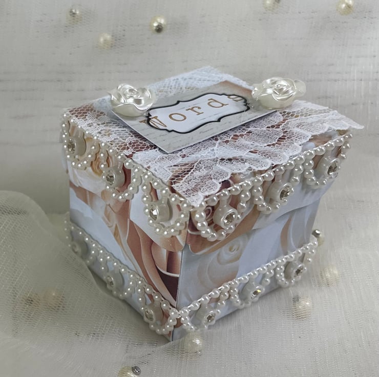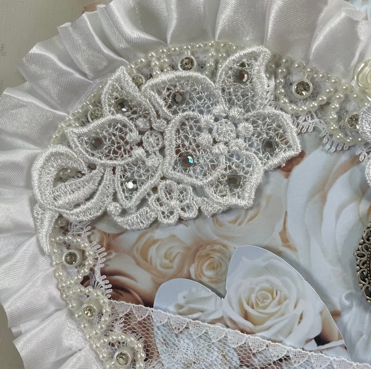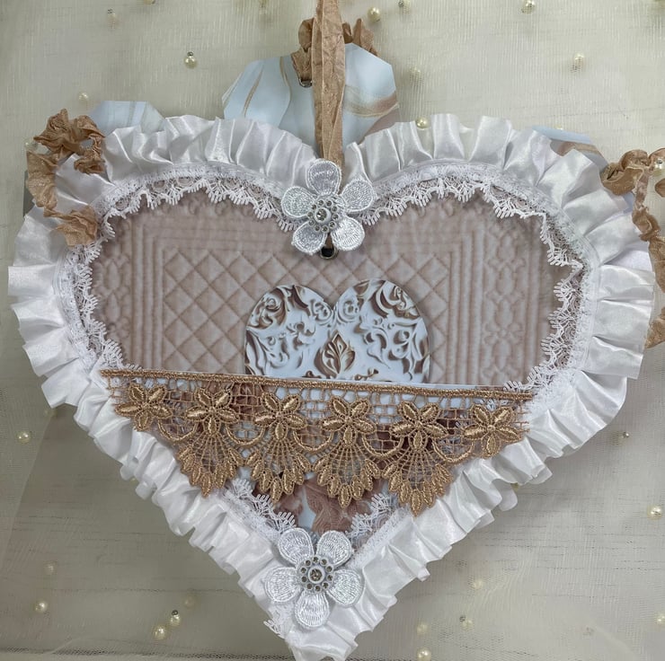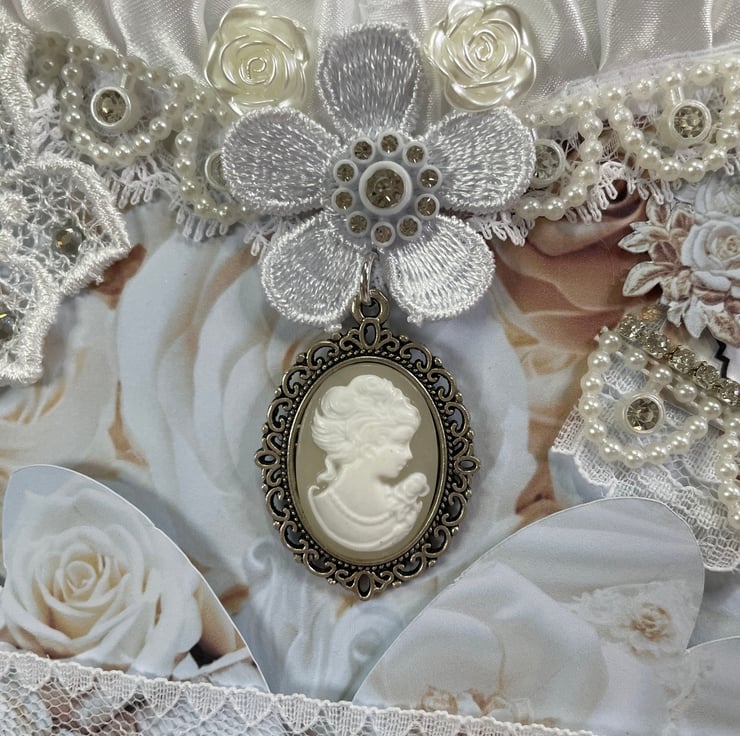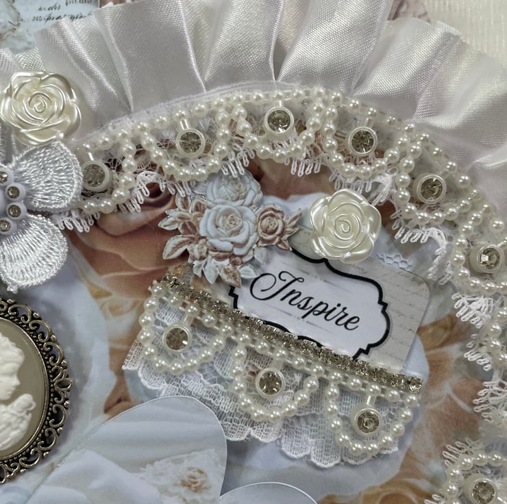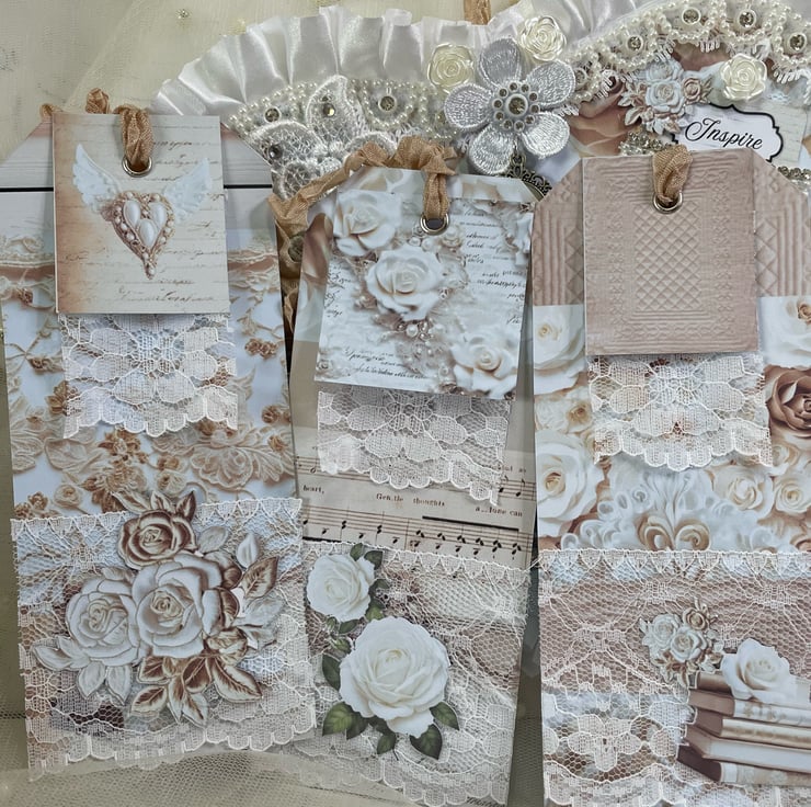 A beautiful pocket heart made from papers called 'French Bliss'. The front and back are sandwiched together to make a pocket, holding 3 beautiful tags. Both hearts are edged with pleated white ribbon and lace. Front heart pearl and diamanté trim, appliqué, snippet word 'Inspire' along with a delicate cameo and appliqué flowers with diamanté centres. catering of ivory acrylic roses. Back here lace mini pocket. Includes 3 heart tags, 3 rectangle tags and approx 48 words in a small or medium tag.
