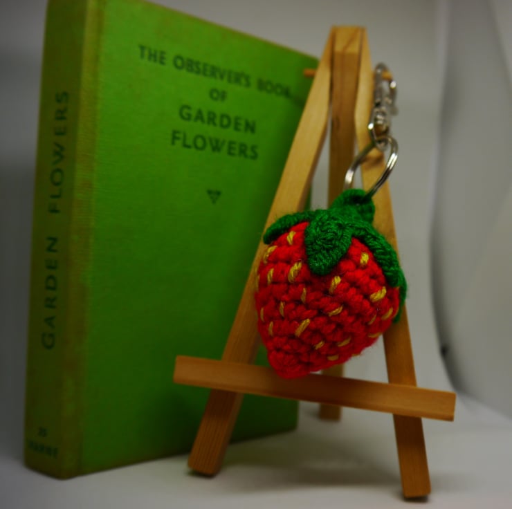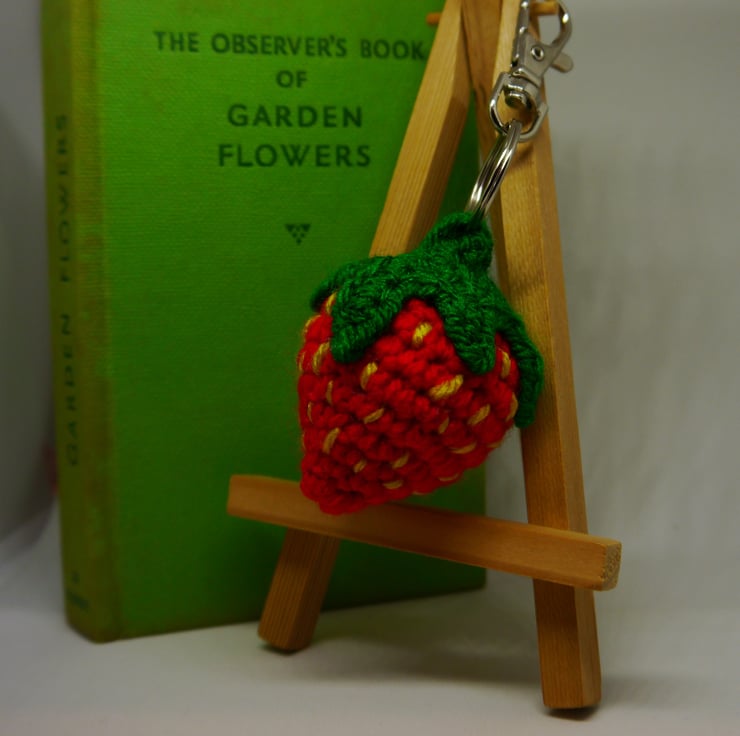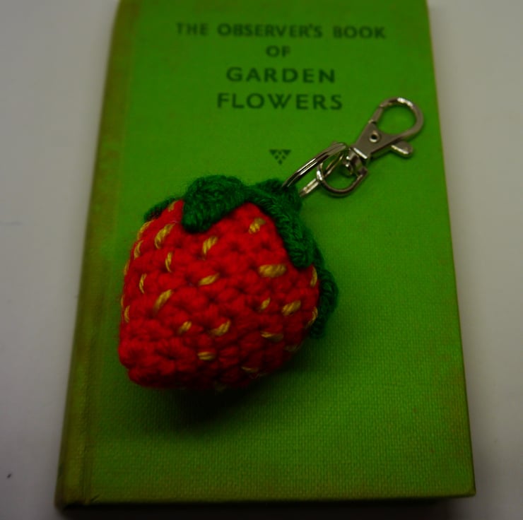 Crochet Strawberry keyring charm, this crocheted strawberry made from soft acrylic wool in red with a bottle green top and yellow green stitched seeds. It has a keyring clip attached comprising of a split ring and swivel lobster clasp making it a versatile accessory. Measuring approximately 2.5 inches (6.5cm) with a 5.5 inch (14cm) circumference. It’s a comfortable size to fit in your hand and the soft hollowfiber stuffing gives a tactile squishy feel. Use this quirky accessory to keep your keys safe or clip it to a bag as a fun and summery accent. Also makes a great gift. Created in a smoke and pet free home, designed as an accessory not a toy.