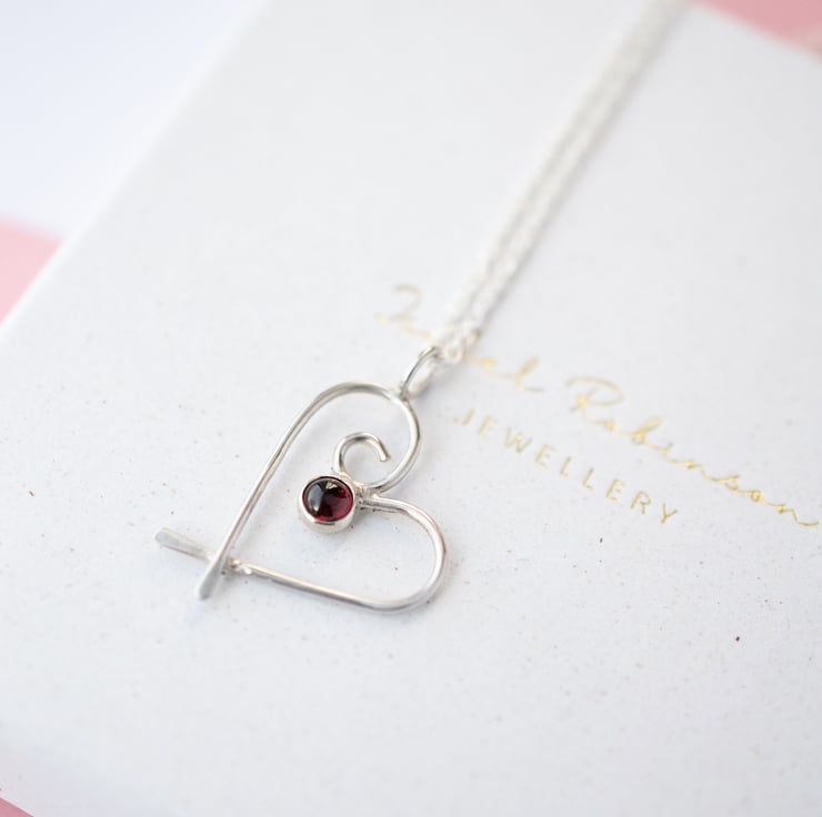 Hand crafted in sterling (925) silver, each heart is hand-shaped in wire before setting a gemstone of rhodolite garnet in the centre. This pinkish form or garnet adds a romantic touch to the design. Once complete, the pendant is hung from a Prince of Wales style chain in your choice of length.