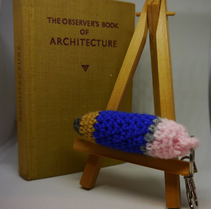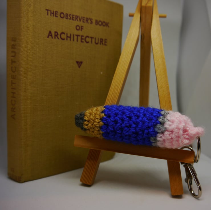 Crochet Pencil keyring charm, this crocheted pencil made from soft acrylic wool in bright blue with a shaped end to represent the lead and a pink eraser at the other. It has a keyring clip attached comprising of a split ring and swivel lobster clasp making it a versatile accessory. Measuring approximately 3.5 inches (9cm) long and 1 inch )3cm) wide. It’s a comfortable size to fit in your hand and the soft hollowfiber stuffing gives a tactile squishy feel. Use it to keep your keys safe or clip it to a bag as a fun and quirky accessory. Also makes a great gift. Created in a smoke and pet free home, designed as an accessory not a toy.