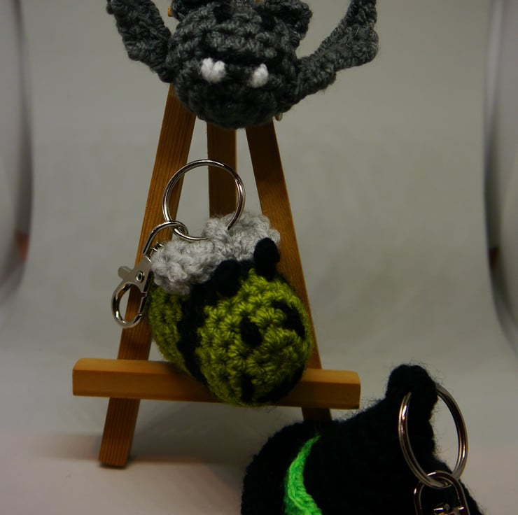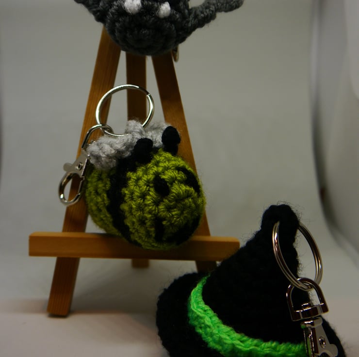 Looking to add some spooky but fun accessories to your life look no further than these cute crochet Halloween keyrings. Set comprising of Witches hat, Bat and a Zom-bee. Each one is made with soft acrylic yarn is suitable colours, filled with hollowfiber filling and finished off with a practical keyring comprising of a split ring and lobster clasp. Use them to keep your keys safe or clip them to a bag as fun and quirky accessories. Also makes a great gift. Created in a smoke and pet free home, designed as an accessory not a toy.