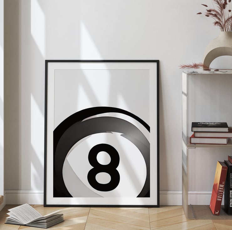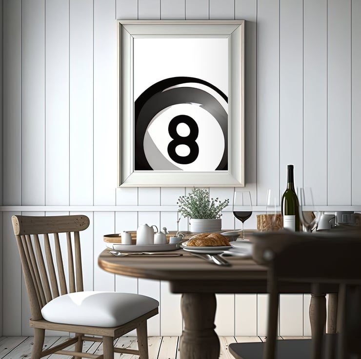 Lucky 8 Ball Art Print Poster, Vintage Black And White Number 8 Ball, Trendy Retro Print, Mid Century Print, Modern Kitchen Wall Art