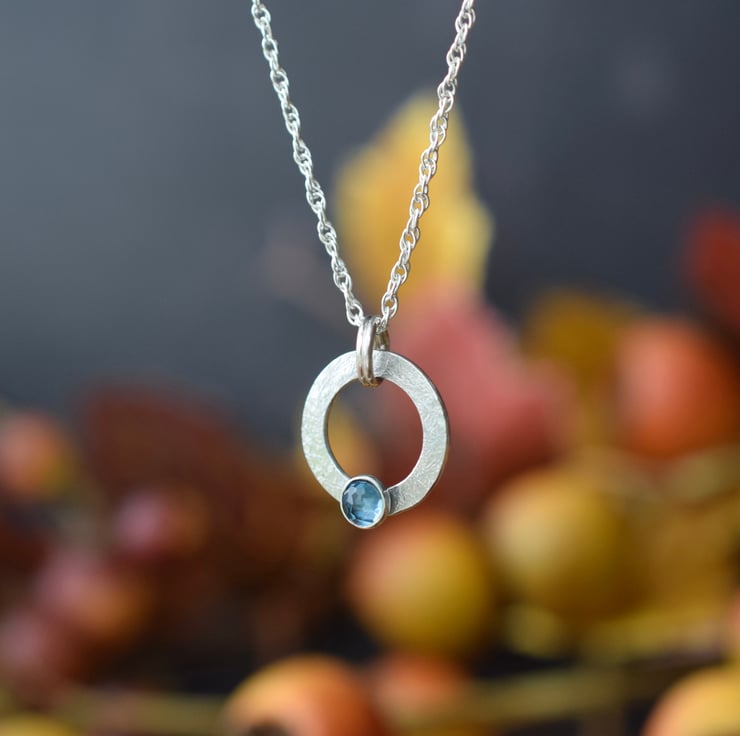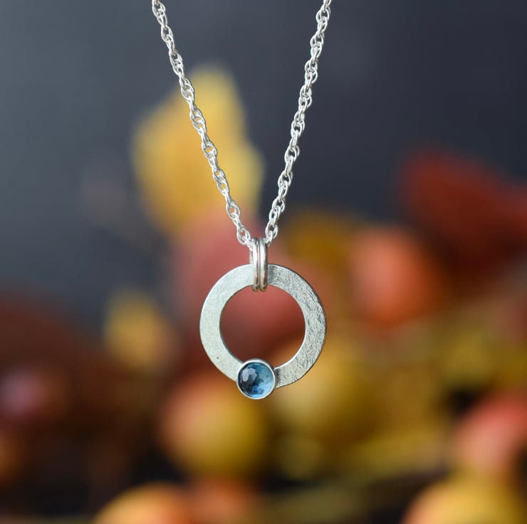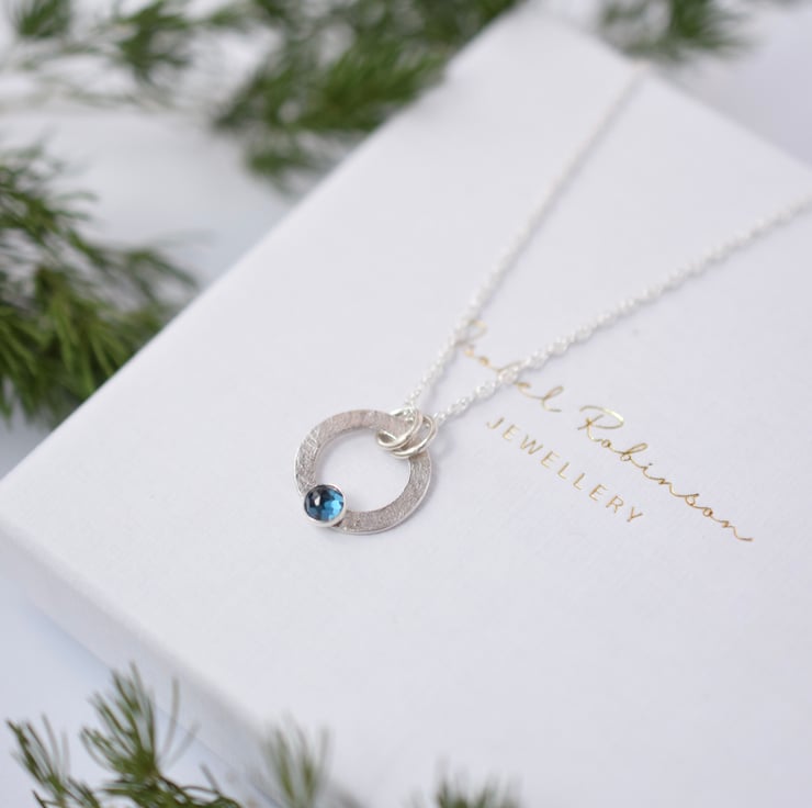 Hand crafted in sterling (925) silver, each circle is formed from silver wire that is hammered to add texture before setting a stone of London Blue Topaz. The rose cut of the stone allows maximum light reflection, bringing extra sparkle to the finished piece. Once complete, the pendant is hung from a Prince of Wales style chain in your choice of length. This simple, on-trend design can be worn alone or layered with other pendants for varied look.