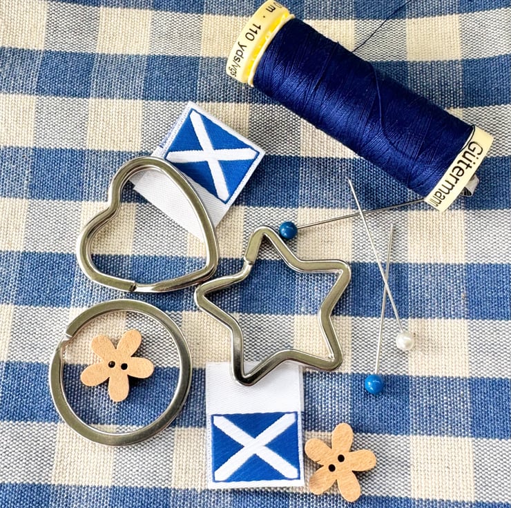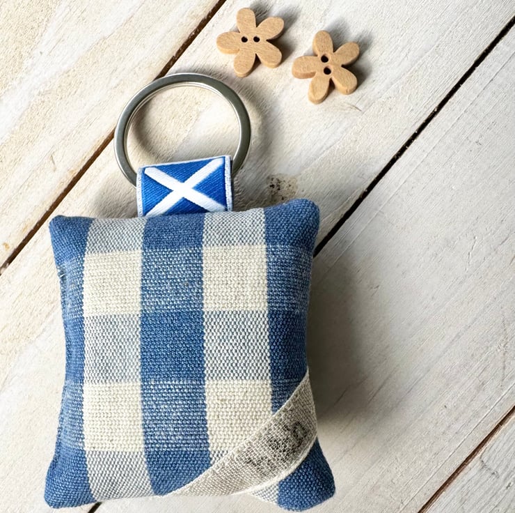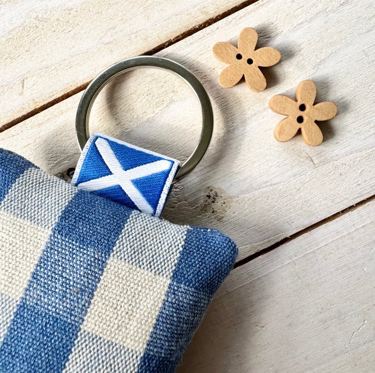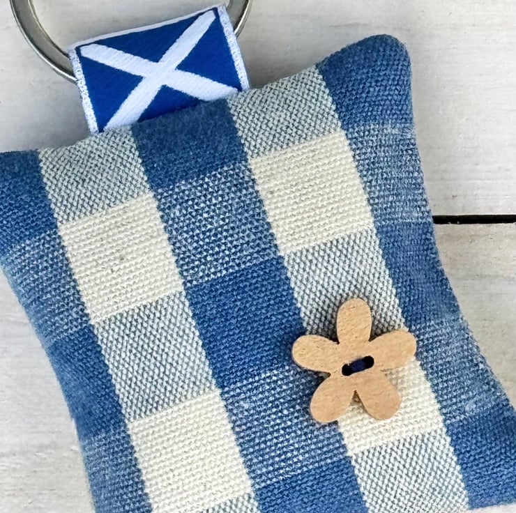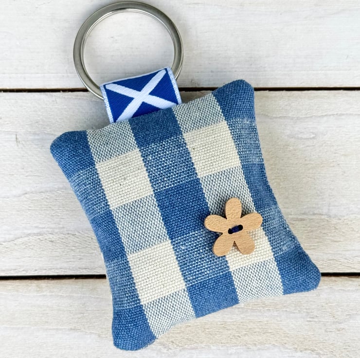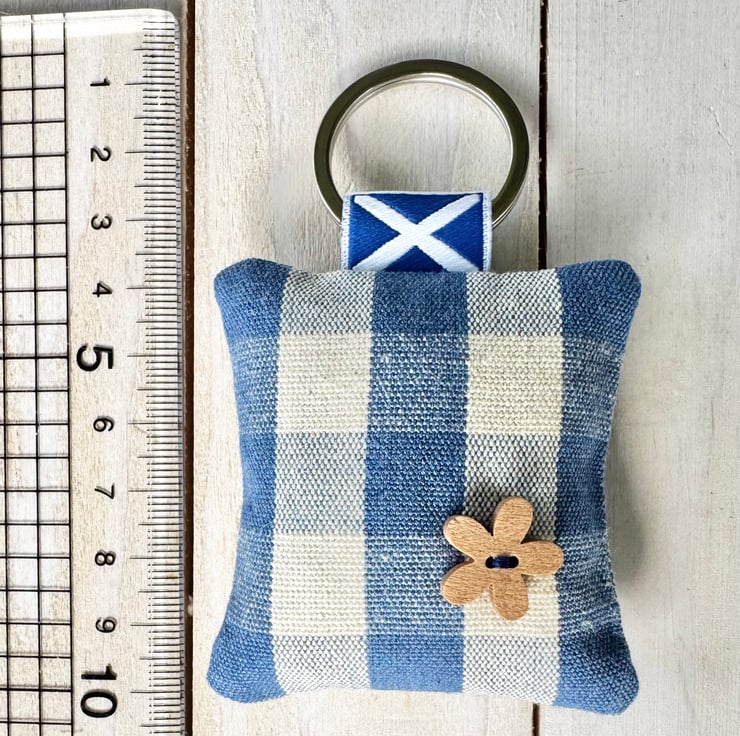 In a superior quality indigo blue woven checked fabric, with a Saltire tab and a stainless steel split ring to hold your keys safe, adorned with a small wooden flower button too, and filled with a scented lavender.
