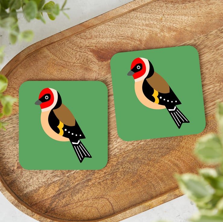 Colourful goldfinch coaster designed by Carolyn and made in the UK using a sustainably sourced eucalyptus board base. It has a lovely, glossy melamine surface and cork backing.