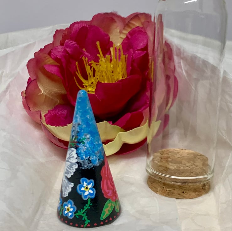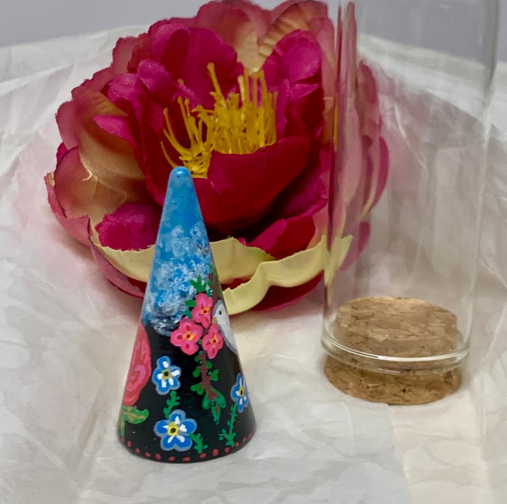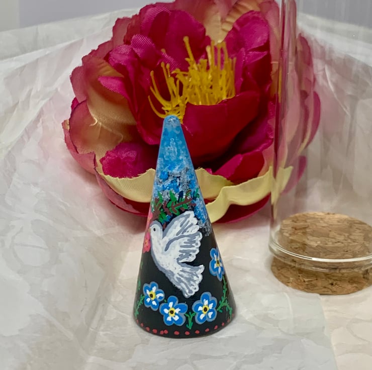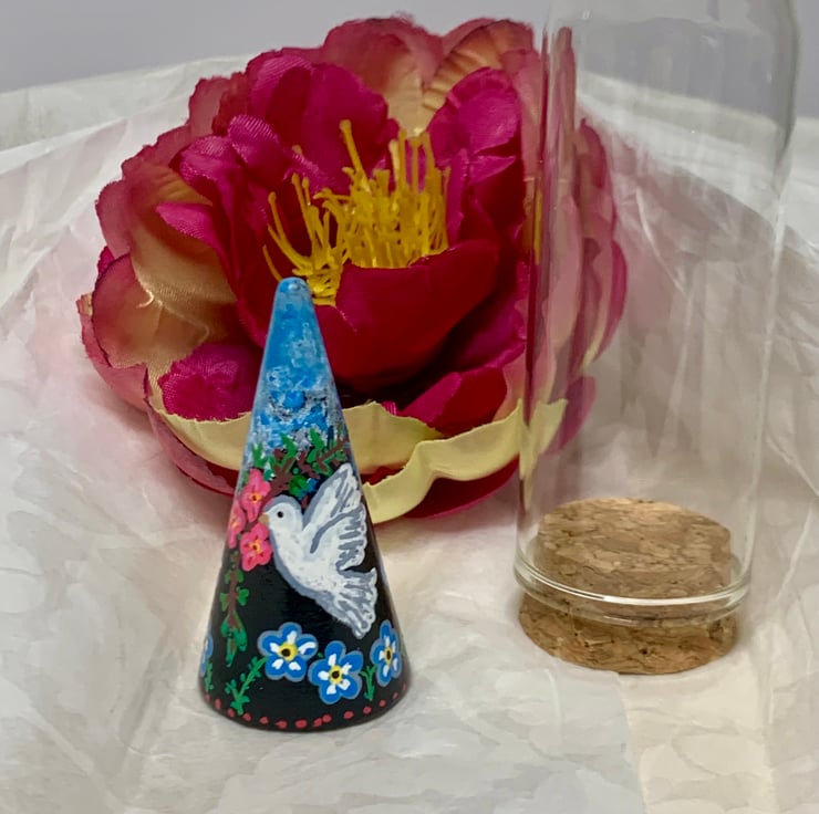 Small wooden hand painted cone with Dove and Flower design. The white dove is carrying 3 small pink flowers whilst below it are Blue Forget me not. On the back of the cone is a Pink and Red Rose. Sky detail to the top.This One of a kind piece comes with a glass display dome giving yourself or a recipient the option of how you choose to display it. This would make a lovely sentimental / memory gift given on occasions such as Birthdays, Anniversaries or as a reminder of a special day.