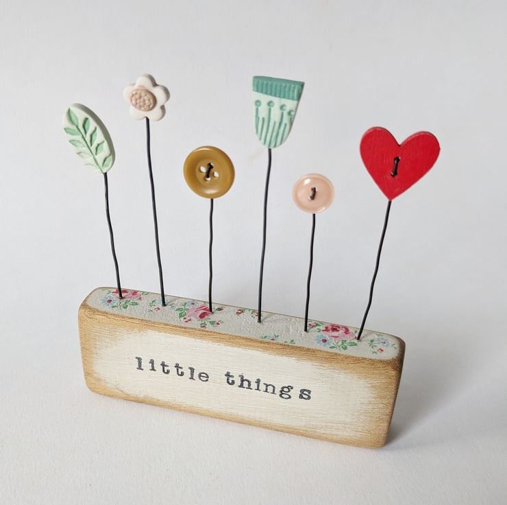 Button flowers grow in a row in this little garden with a clay leaf and flowers. They stand on their wire stalks in a wooden block with a decoupaged floral top.
