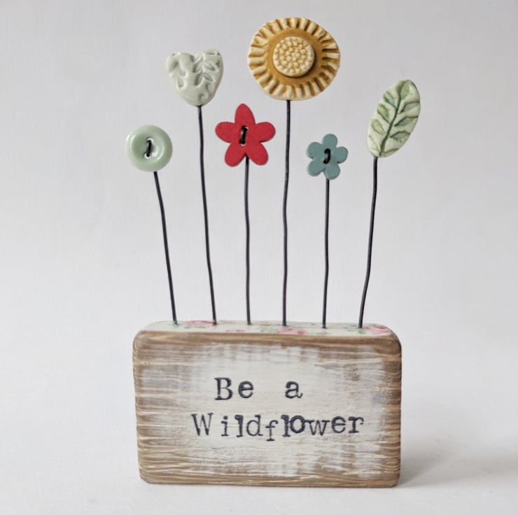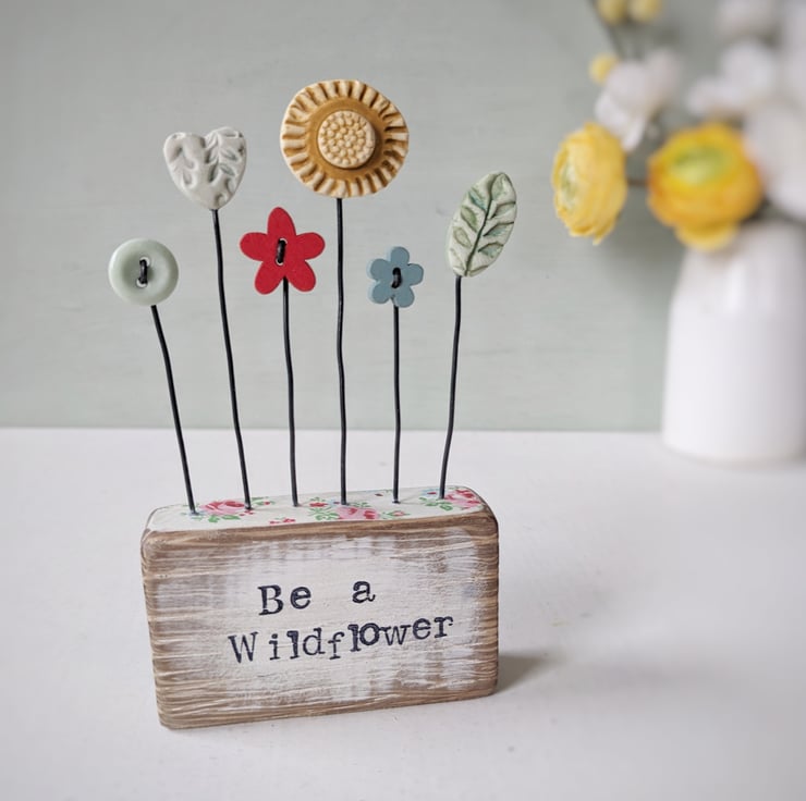 Button flowers grow in a row in this little garden with a clay leaf, heart and flower. They stand on their wire stalks in a wooden block with a decoupaged floral top.