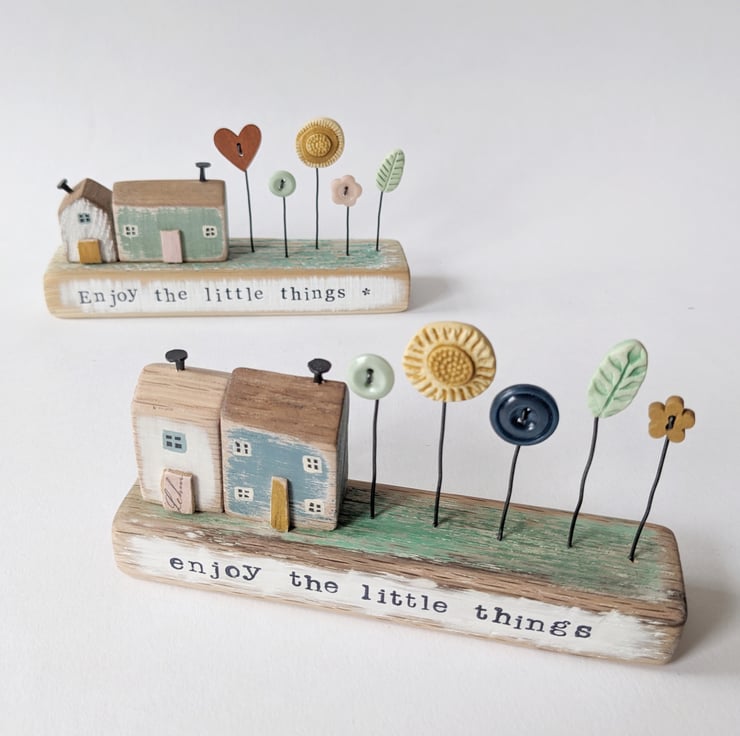These little hand-painted wooden homes have teeny doors and windows and a garden of button and clay flowers.