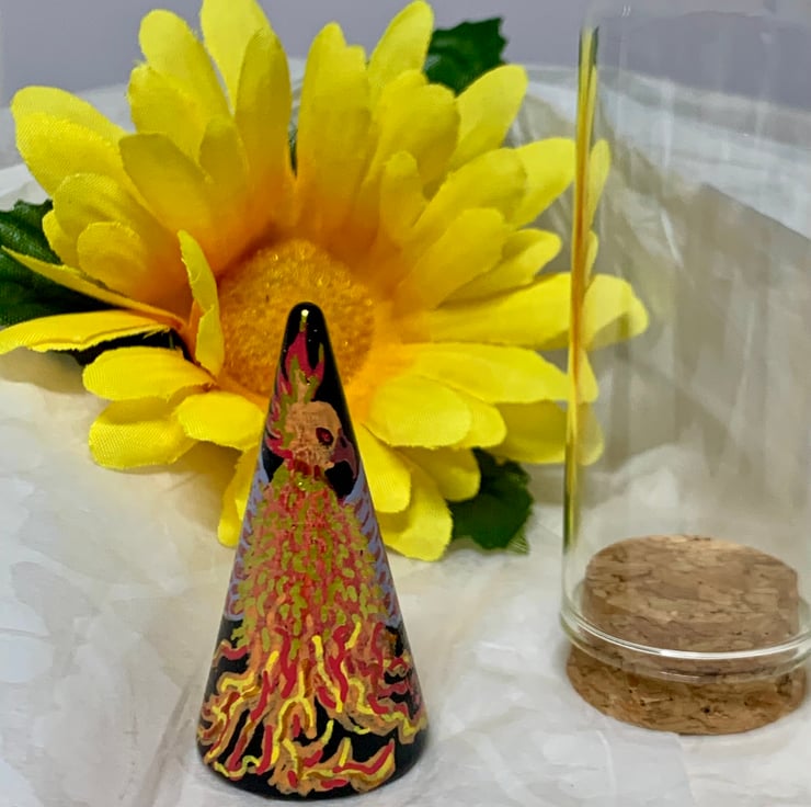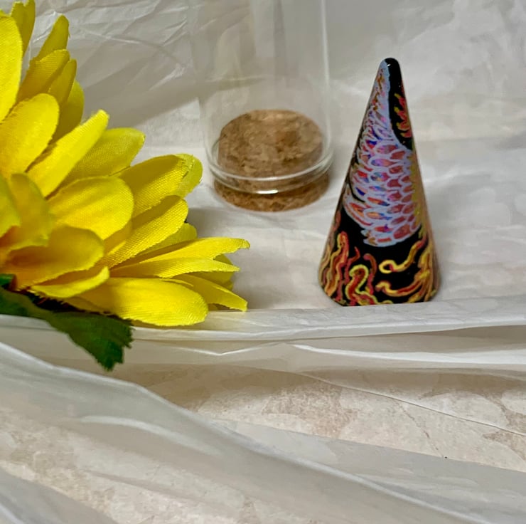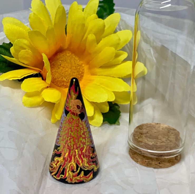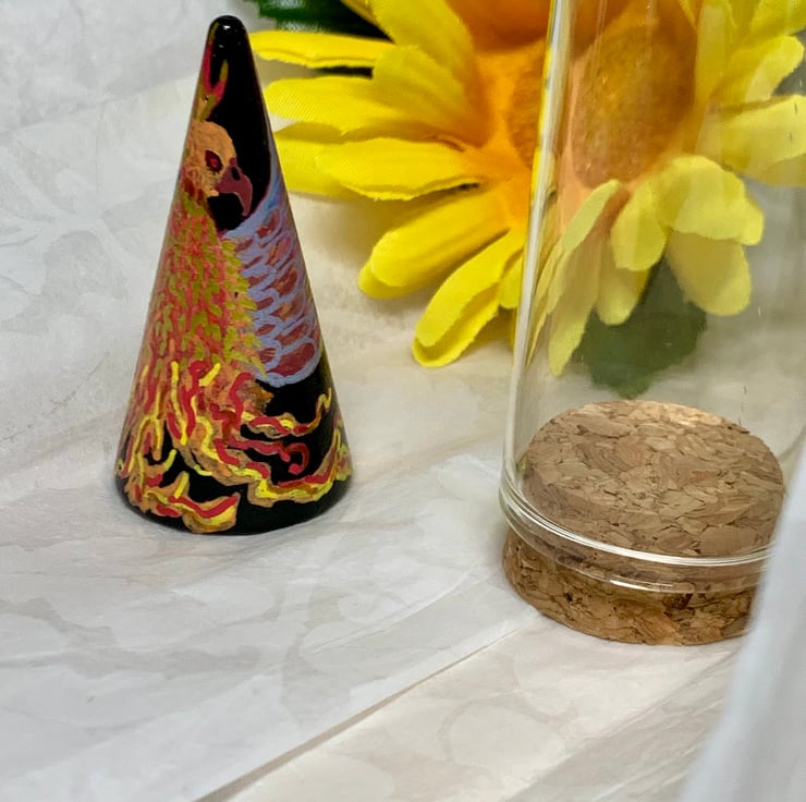 Small wooden Hand painted cone decorated with a Phoenix rising from the flames. The colour tones of red,orange and yellow on the bird and flames glimmer with a hint of metallic.