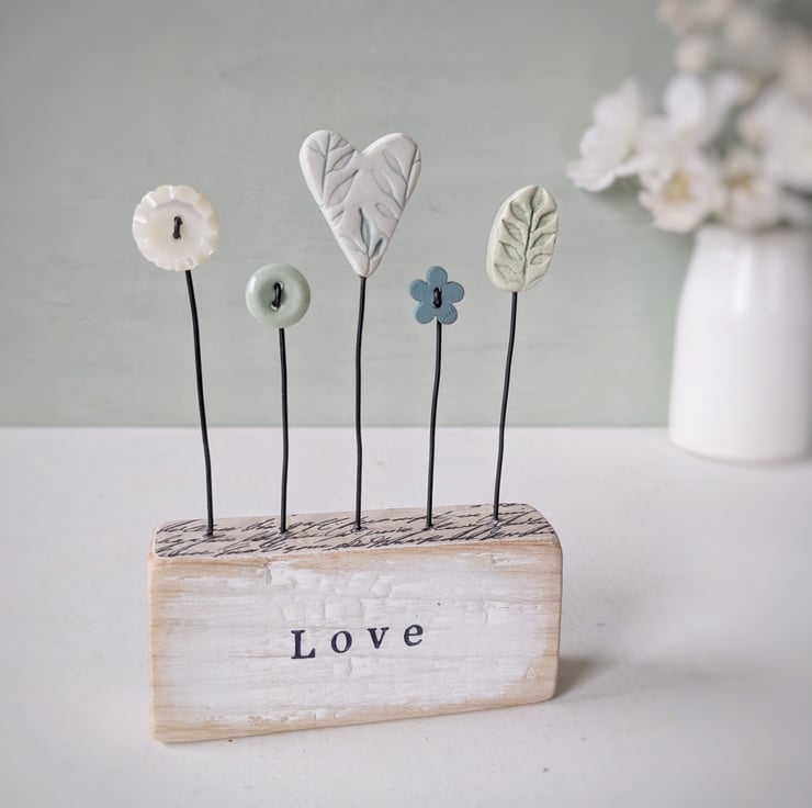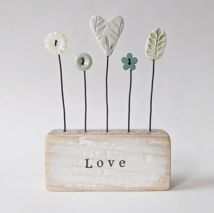A pretty clay heart stands on a wire stalk in a painted wooden block.