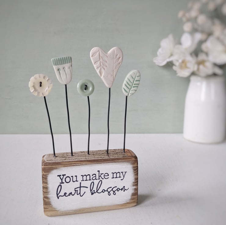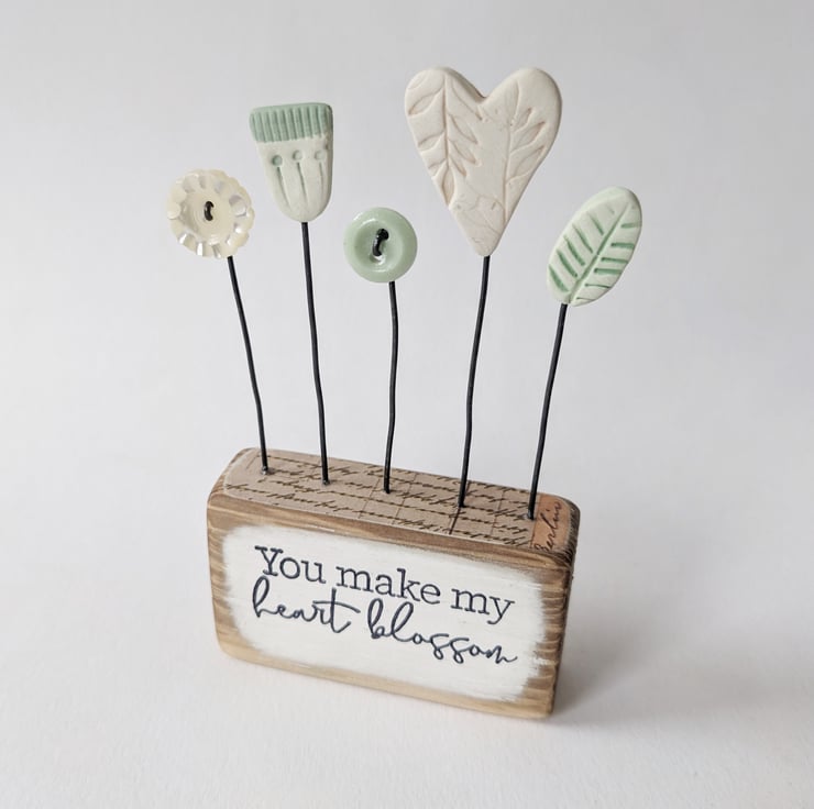 A pretty clay heart stands on a wire stalk in a painted wooden block.