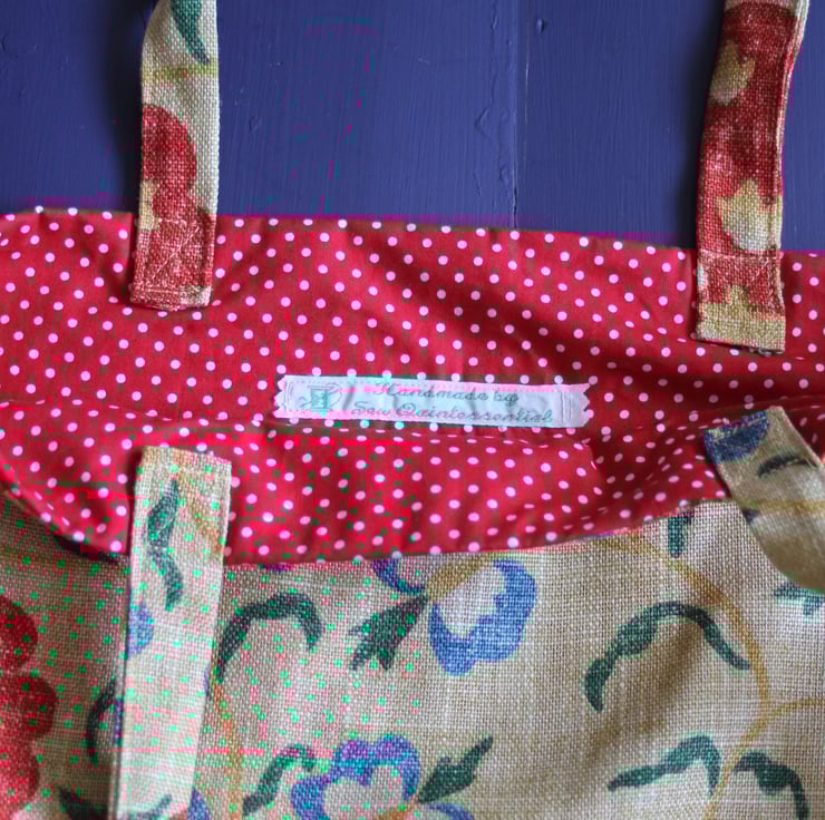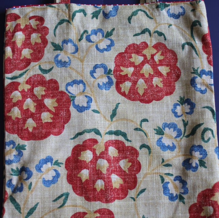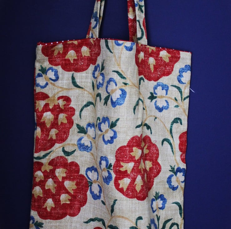Perfect for Spring, this gorgeous floral shopping bag is made from a remnant of Sanderson Marrakesh linen fabric featuring a pattern of pomegranates and flowers in shades of brick red, blues and greens against a sand background. It is lined with a red polka dot cotton fabric. The fabric is unused and dates back to 2011.