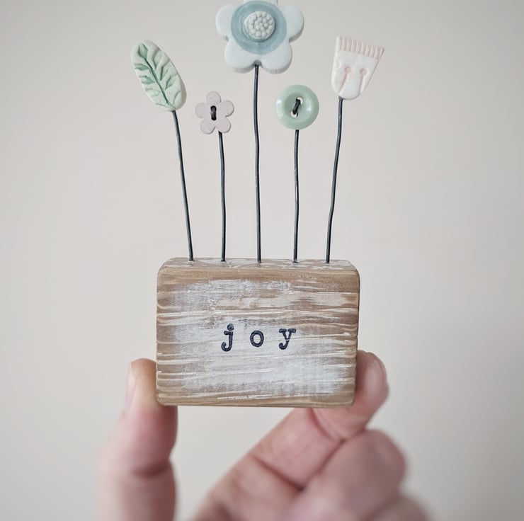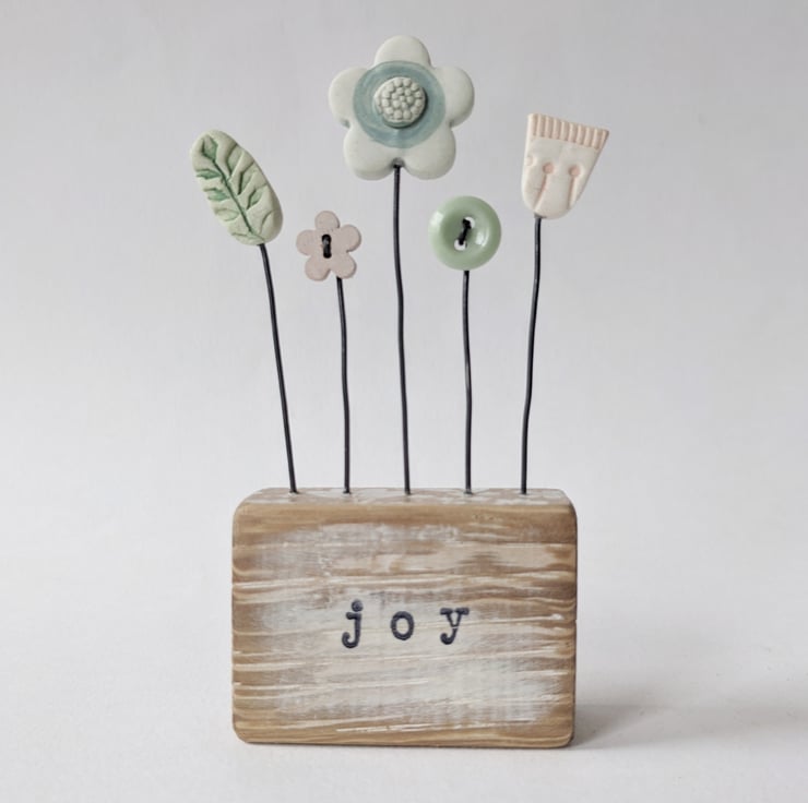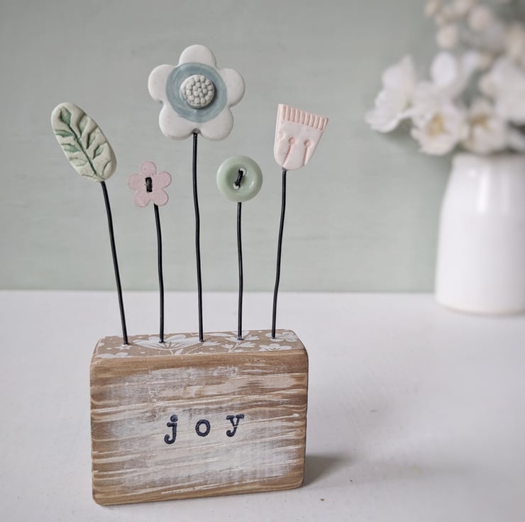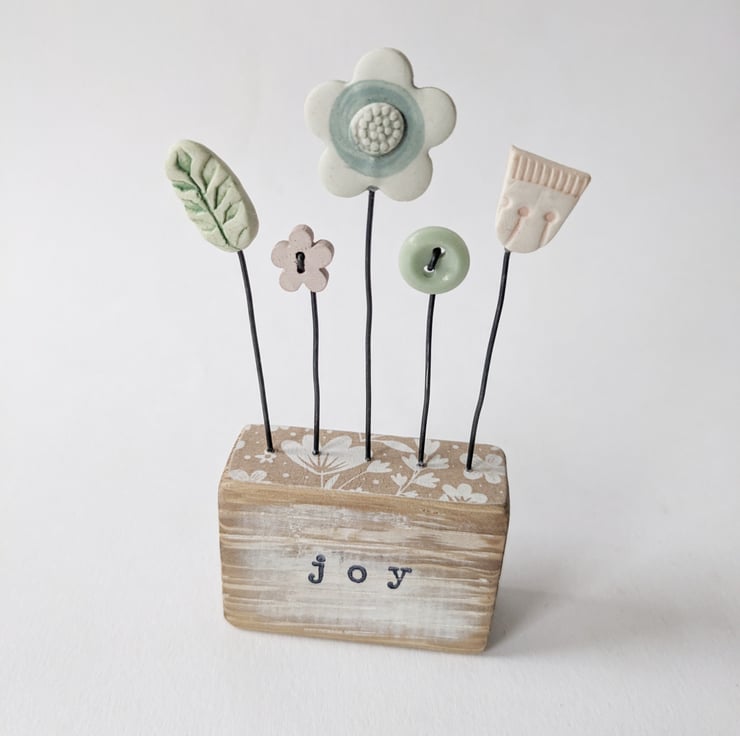 Pretty clay flowers stand on wire stalks in a painted wooden block.