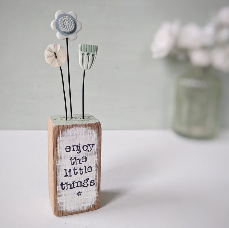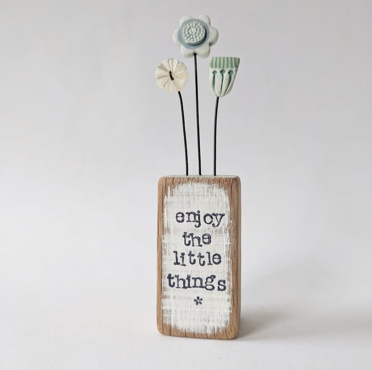 The front of the wooden block is hand stamped with the words 'enjoy the little things'.
