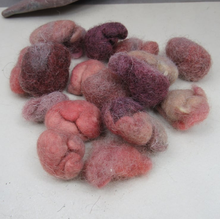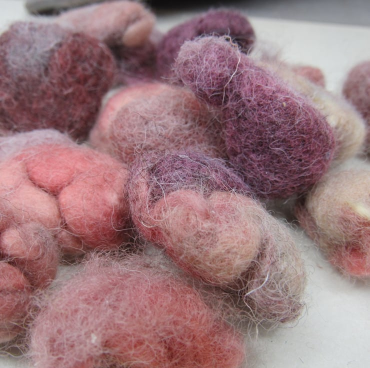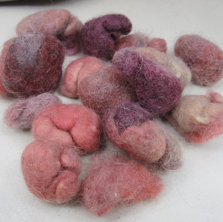 Small felt nuggets in a range of pinks and lilac, made from naturally dyed blended wools