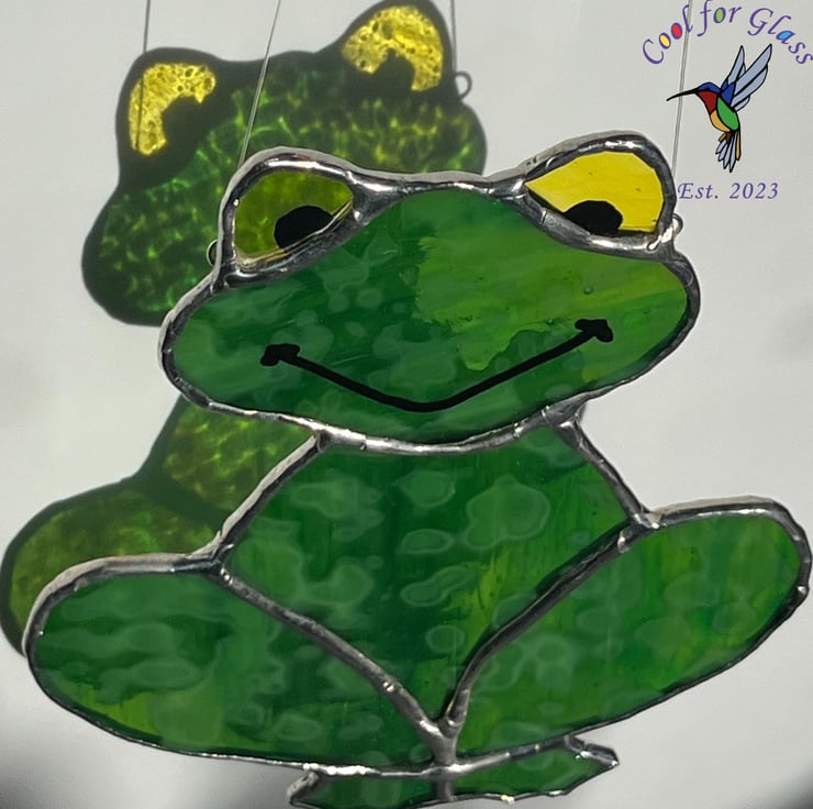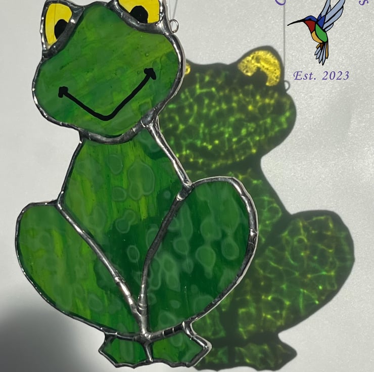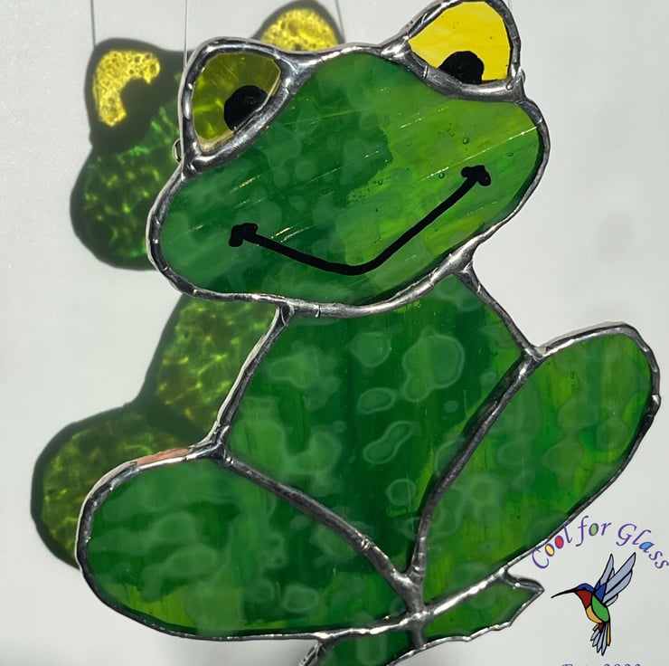 I have only one of this absolutely gorgeous frog sun catcher and have been tempted to keep this one for myself! Just look at the stained glass selection, just perfect with its mottled pattern. The cute happy smile and yellow eyes just make you feel good and when the sunlight casts the reflection, you will be thrilled the the beautiful patterns. Just wow!