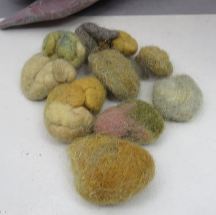 After carding the batts, there are always odds and ends of fleece left over. These are collected until there are enough, then felted into these amusing nuggets. The nature of the scraps and the process means that the results are unpredictable in size and colour, but they are all very cute!