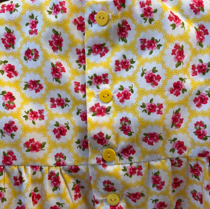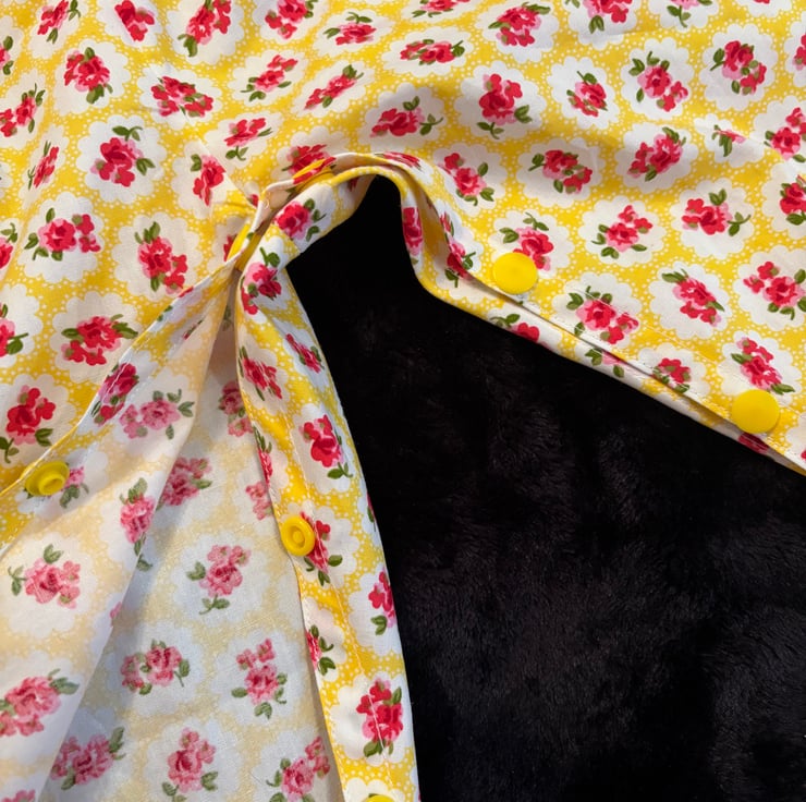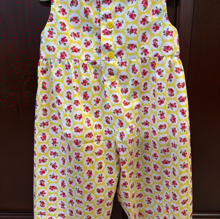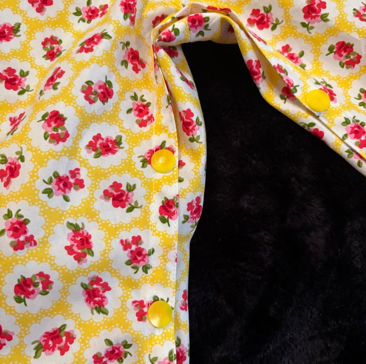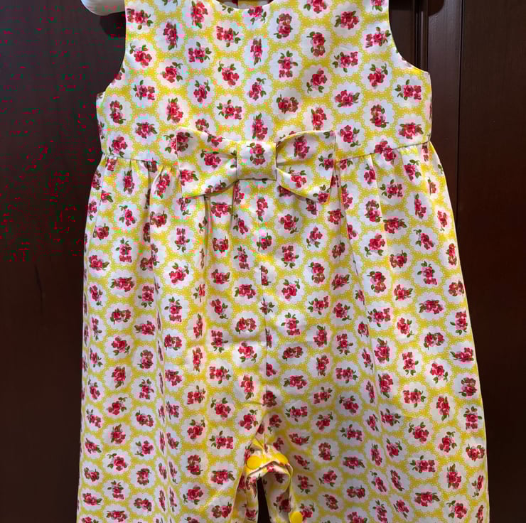 The whole of the inside legs open up to make nappy changing easier. Open and closed with coloured poppers.