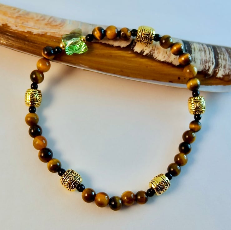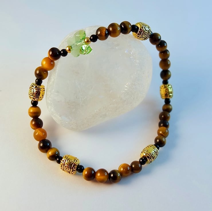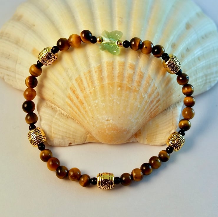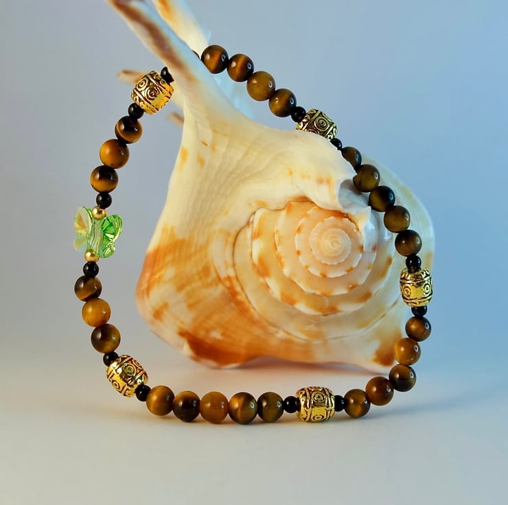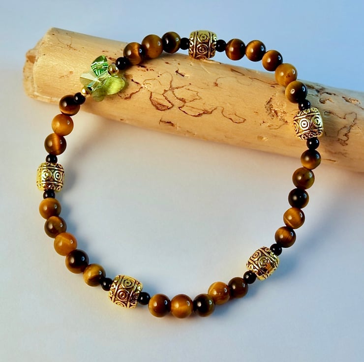 Dainty stretch bracelet of 4mm Tiger Eye interspersed with Tibetan style antique gold barrel beads, highlighted with tiny 2mm black Onyx and embellished with an 8mm quality Austrian crystal butterfly bead in the colour 'peridot'.