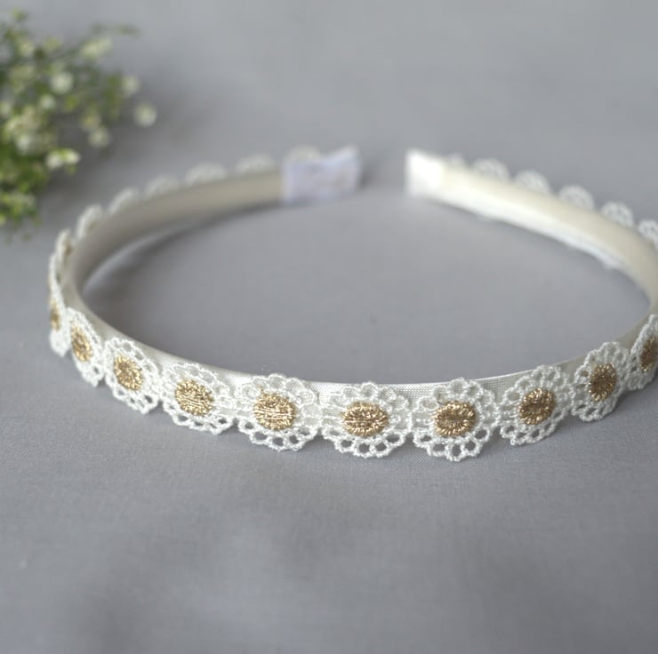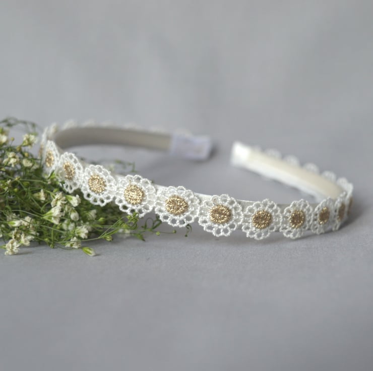 Beautiful off white aliceband with a little off white and golden daisy flowers.