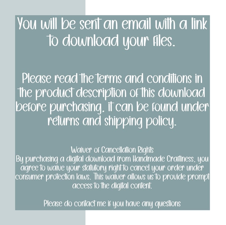 Refund Policy for Digital Downloads Acceptance of Terms By completing your purchase, you acknowledge and accept this refund policy. At Handmade Craftiness, we are committed to providing high-quality digital products. Please read our refund policy carefully before making a purchase: Waiver of Cancellation Rights By purchasing a digital download from Handmade Craftiness, you agree to waive your statutory right to cancel your order under consumer protection laws. This waiver allows us to provide prompt access to the digital content. No Refunds After Download For digital downloads, consumers are required to waive their cancellation rights before the digital content can be provided. This means that once a customer (i.e., the consumer) has downloaded the content, they have given up their consumer rights to a refund. This policy aligns with consumer law for digital goods, ensuring the protection of intellectual property and preventing unauthorized distribution. Cancelling a Digital Download Under the Consumer Contracts Regulations 2013, digital downloads are neither goods nor services, meaning the law is a little different. If you want to download something within 14 days of buying it (known as the 'cooling-off’ period), you must give your consent to waive the 14-day cooling-off period. If you do not give your consent, the 14-day cooling-off period still applies. However, you will not be able to download your digital content until this period has ended. This policy exists to prevent customers from changing their minds after downloading the content. As you are being sent a link via email to download after purchase this will count as downloading the content as you will have access to download the files from the email. Eligibility for Refunds Refunds may only be issued under exceptional circumstances, such as: The digital content is proven to be defective or incomplete. An error on our part (e.g., duplicate billing). Contact Us If you believe you are eligible for a refund due to one of the exceptional circumstances above, please contact us at orders@handmadecraftiness.co.uk with your order details, a description of the issue, and proof of purchase. Our team will review your request and respond within 7 business days. For further inquiries, please contact us at orders@handmadecraftiness.co.uk. ------------------------------------------------------------------------------------------------------------------------------------------------------------- Ownership and Usage: All artwork within this shop is the exclusive property of Handmadecraftiness. You are expressly prohibited from reproducing, altering, redistributing, reselling, or claiming ownership of any digital item from this store. However, you are permitted to incorporate products from this store into your own physical handmade items for sale as a hobbyist. TERMS OF USE 1. You may print and use these items in a tangible journal/scrapbook/craft project etc. 2. You MAY NOT sell or share these files. 3. You MAY NOT reproduce/alter/redistribute our designs as a digital or physical item. 4. You MAY NOT sell or manipulate these files for resale purposes. 5. You MAY NOT share these files individually or as kits.
