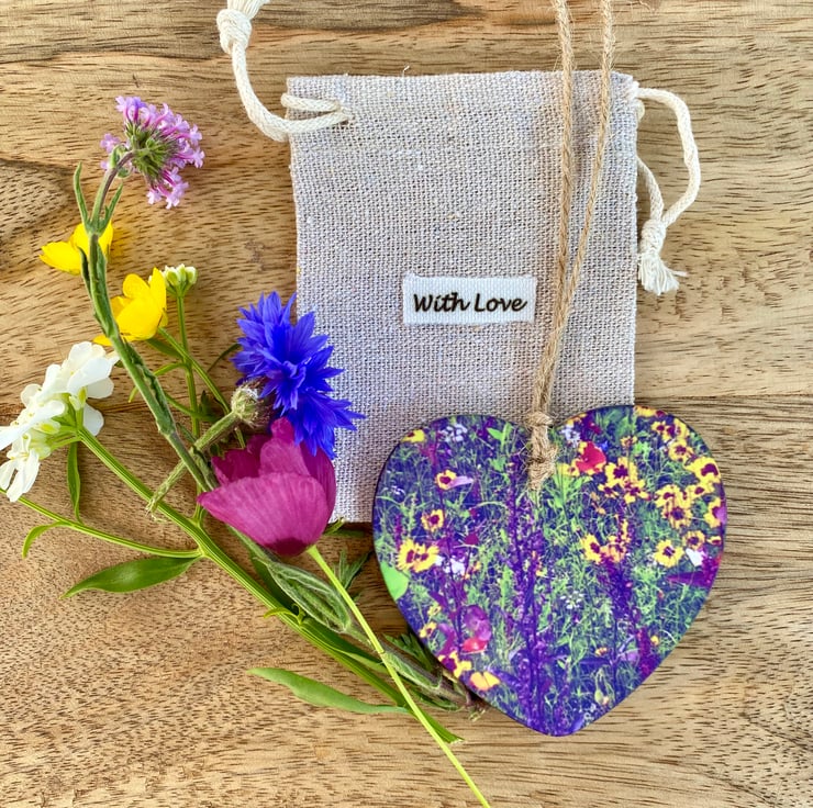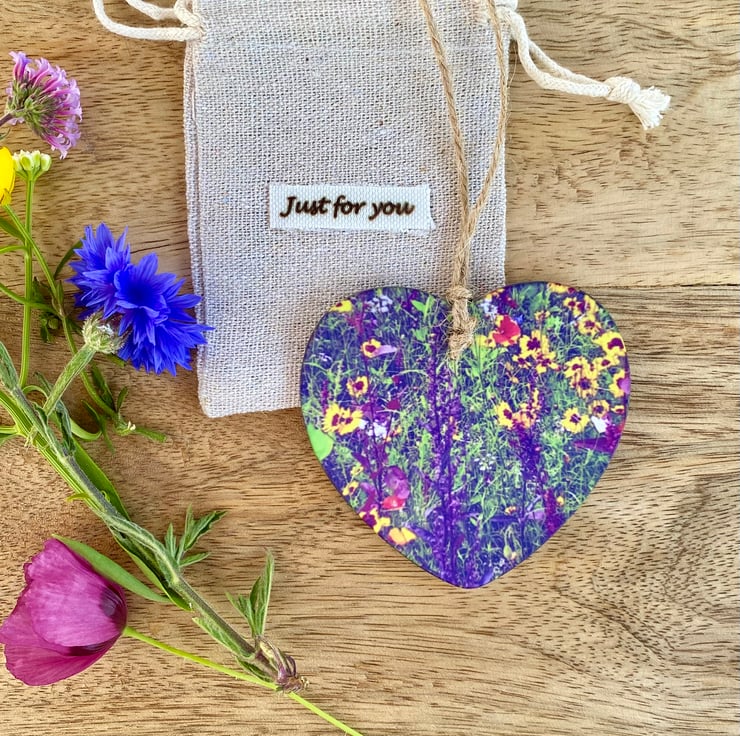 This heart captures the beauty and vibrant colour of a wildflower meadow photographed in Staffordshire and then printed onto the heart using sublimation printing.