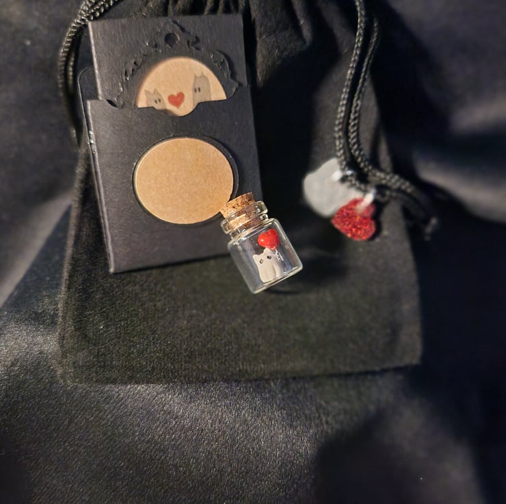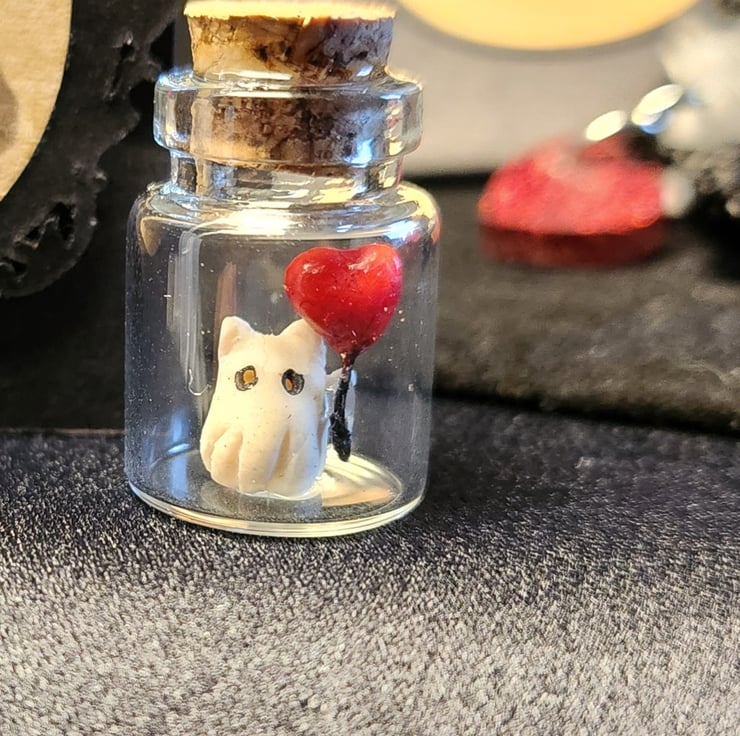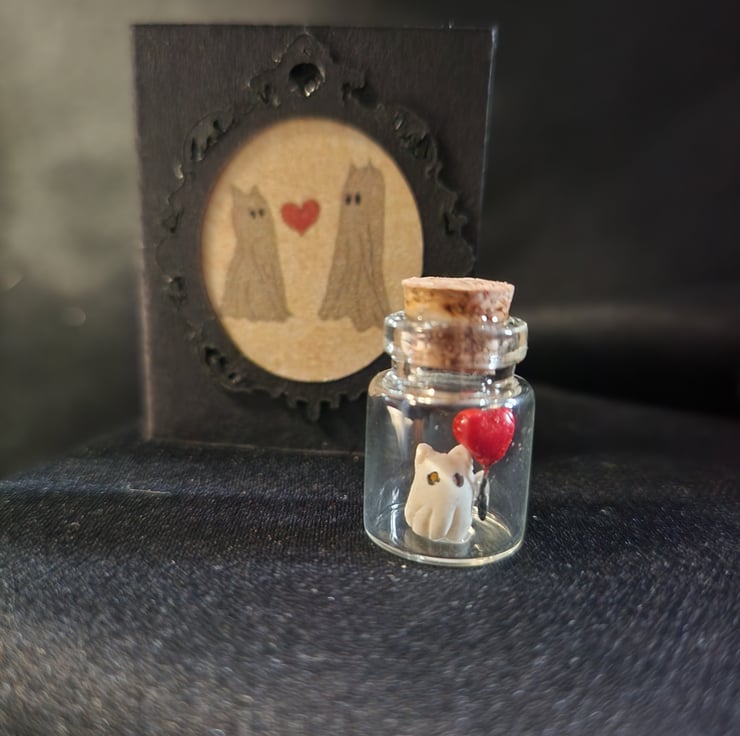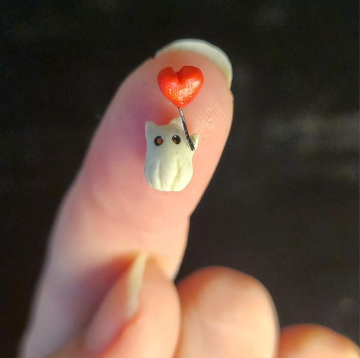 Micro miniature valentines ghost cat with heart balloon and miniature valentines card