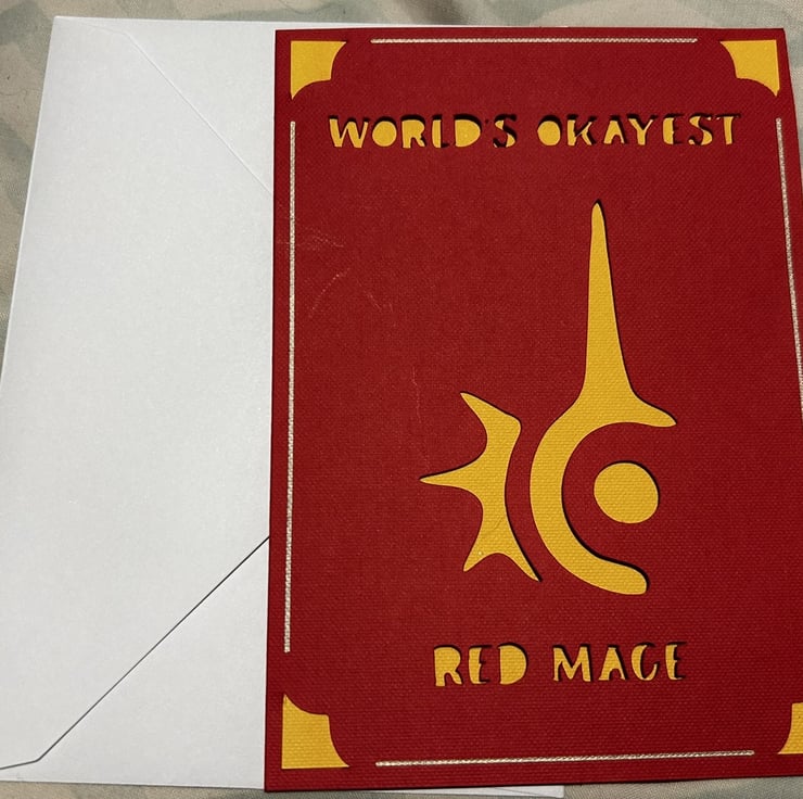 Inspired by the critically acclaimed MMO FFXIV, this card is perfect for that special Red Mage in your life. The card is blank so is suitable for all occasions and comes with its own envelope.