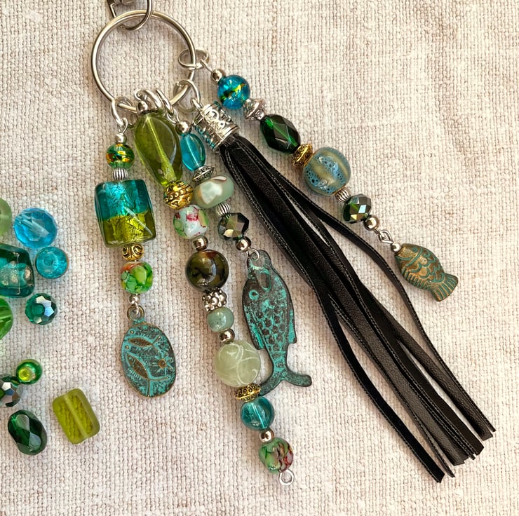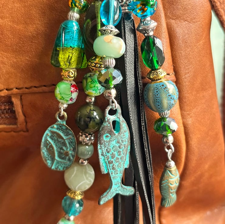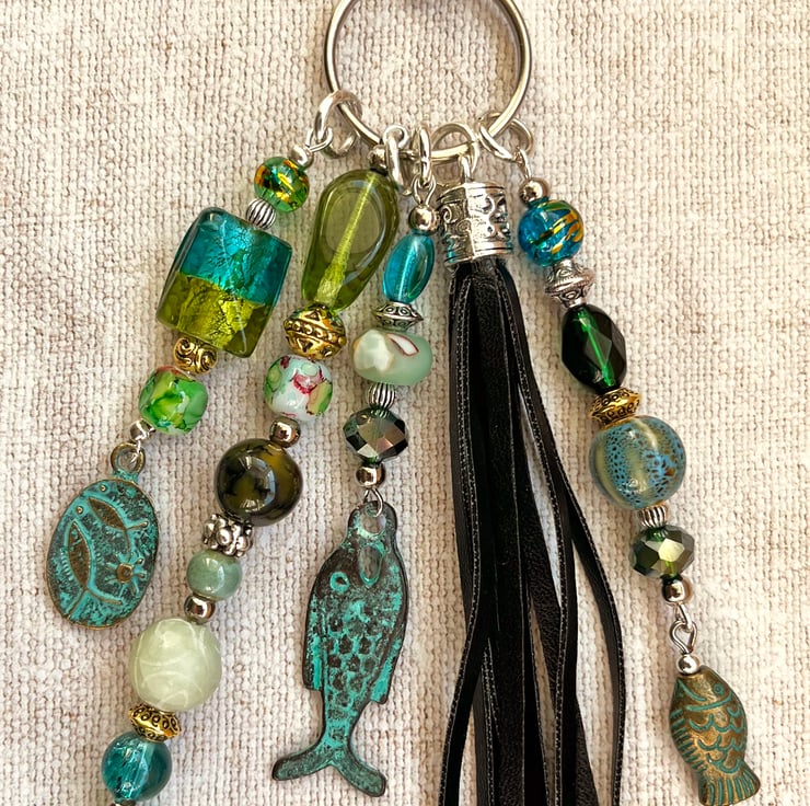 Here is a great gift for a Pisces or fish lover. This boho bag charm with a pretty mix of ocean-coloured beads will brighten up their bag.