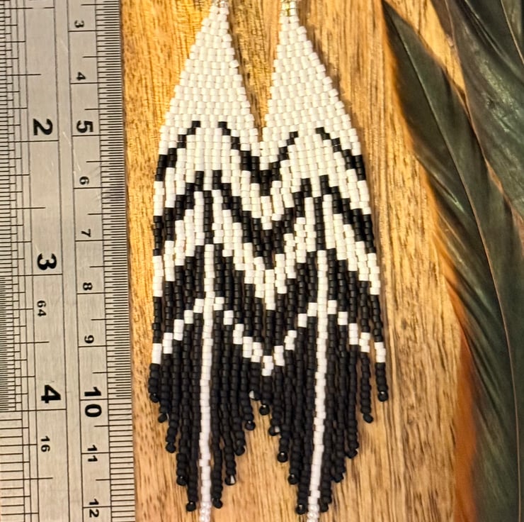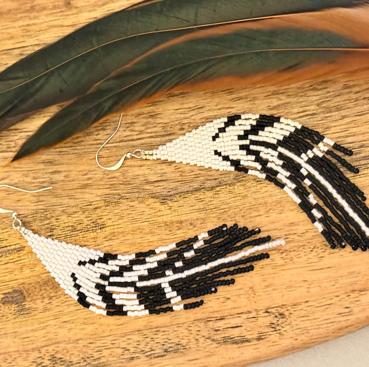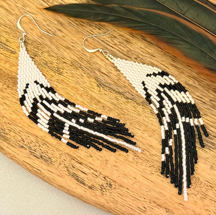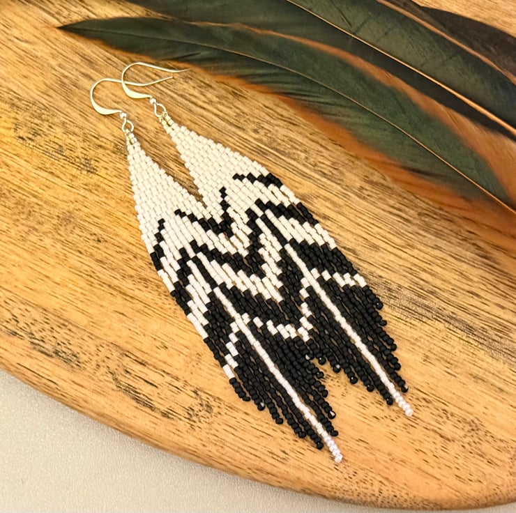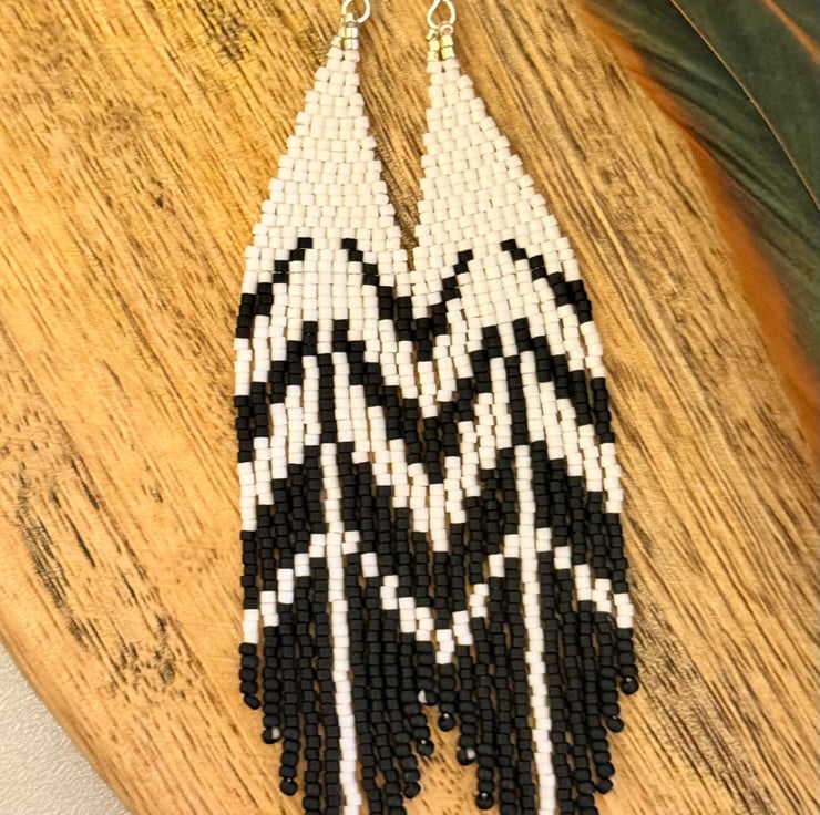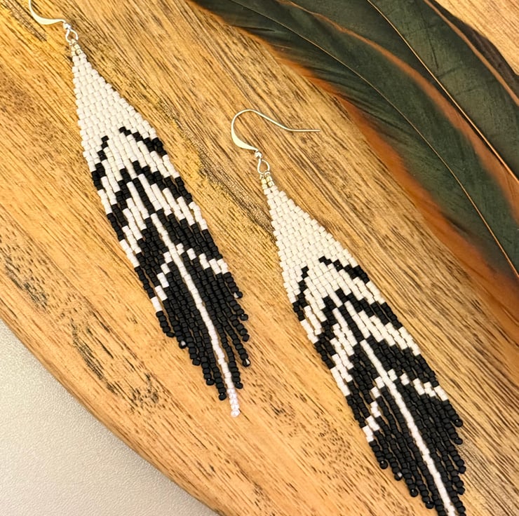 Long black and white beadwork feather earrings. These earrings are handmade by me with tiny Miyuki beads that are handwoven together in a double row to form the top of these earrings.
