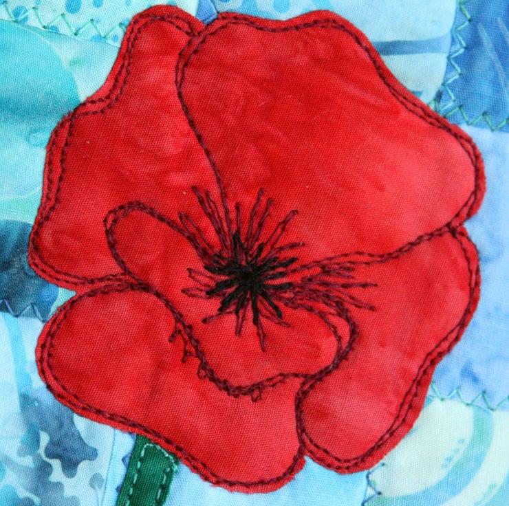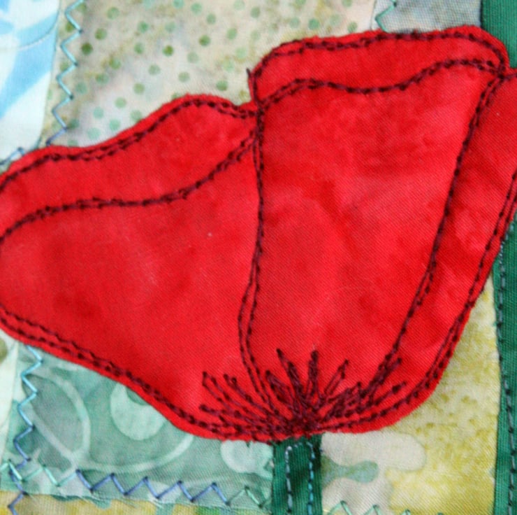 This design uses raw edge applique and fabric collage. I would recommend this to crafters familiar with free motion embroidery.