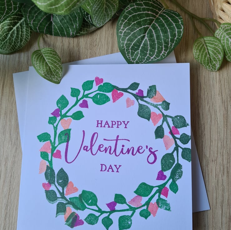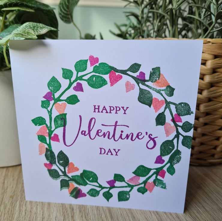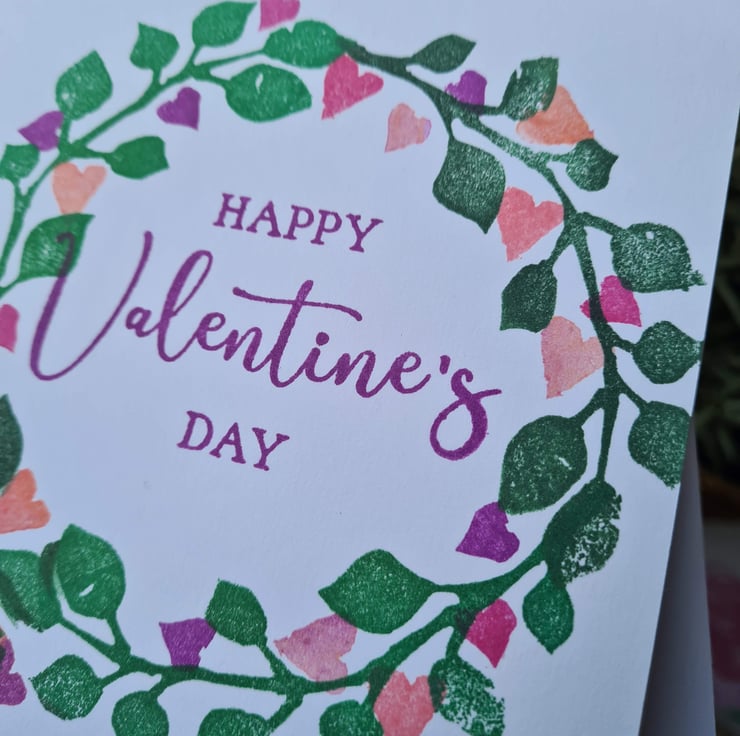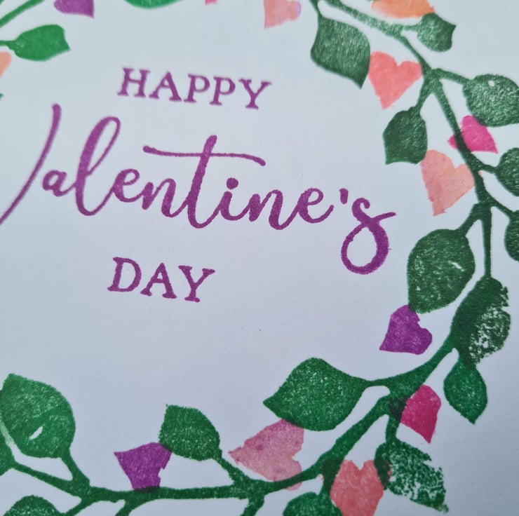 This card is handprinted from my own carved stamps of ivy and hearts, and finished with a handprinted text stamp.