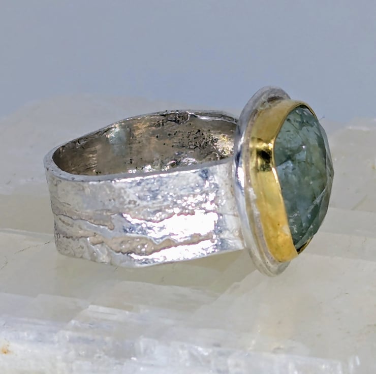 This size O 1/2 ring has been hand crafted in recycled sterling and gold with an ethically sourced aquamarine freeform stone. Because of the way I source my gemstones and the process of reticulation and acid etching each piece is unique. This stone is heat sensitive and unfortunately can't be resized.