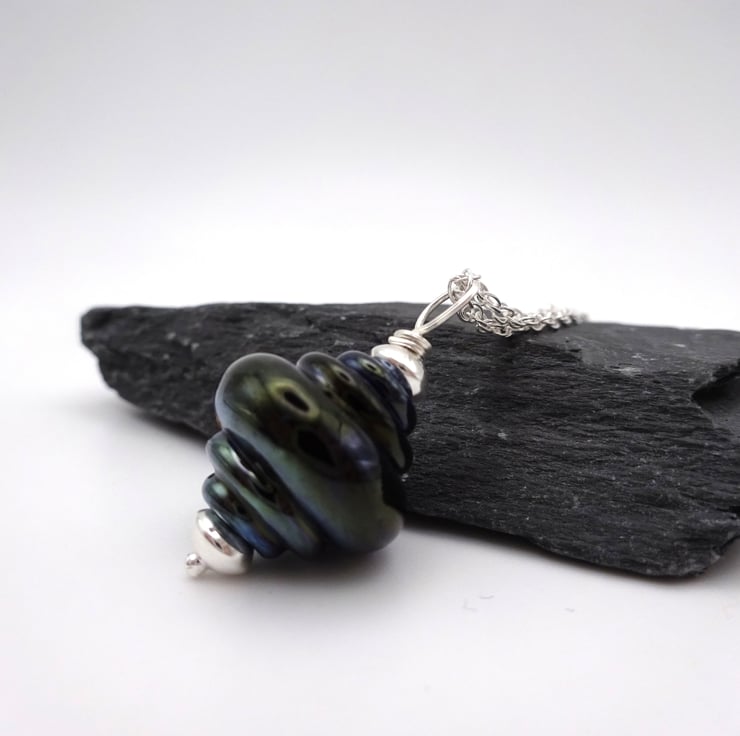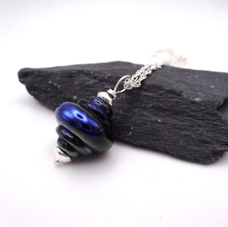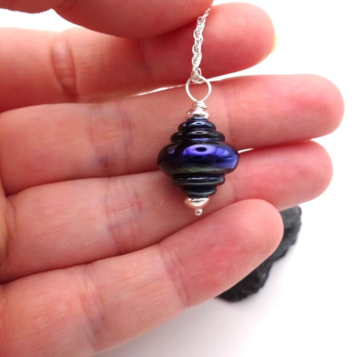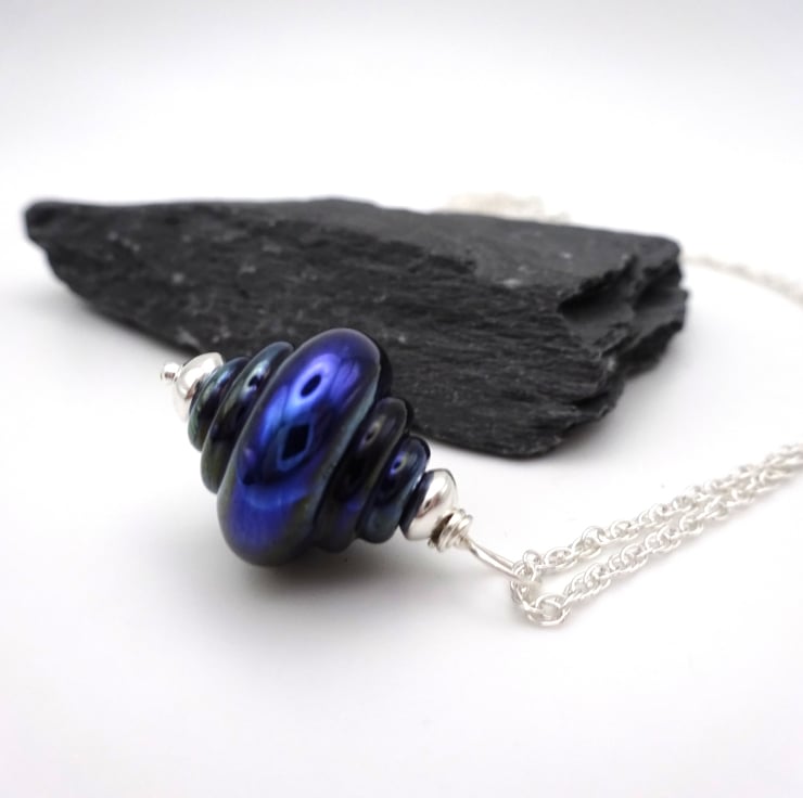 A handmade lampwork glass blue metallic pendant strung onto a sterling silver chain.